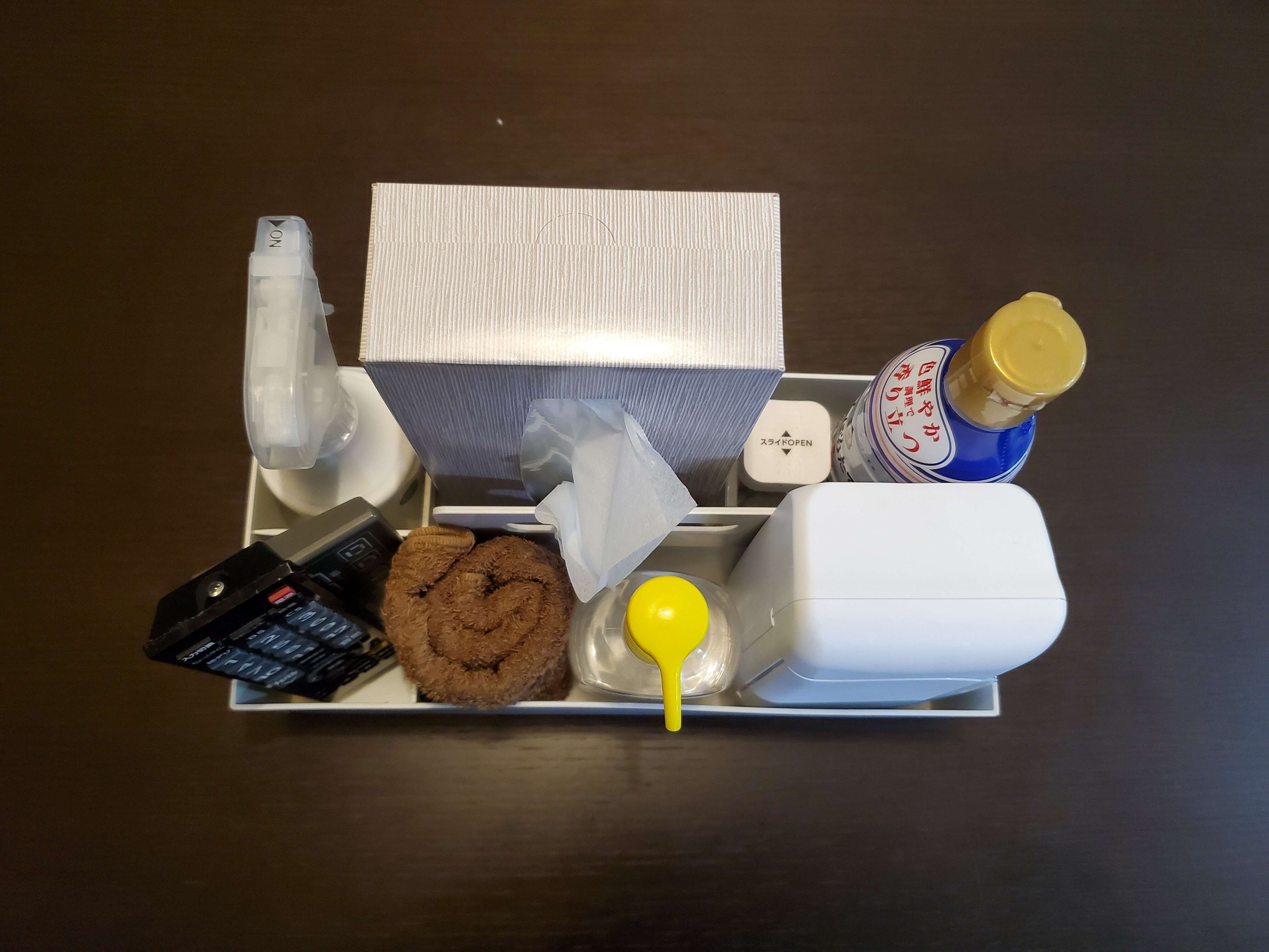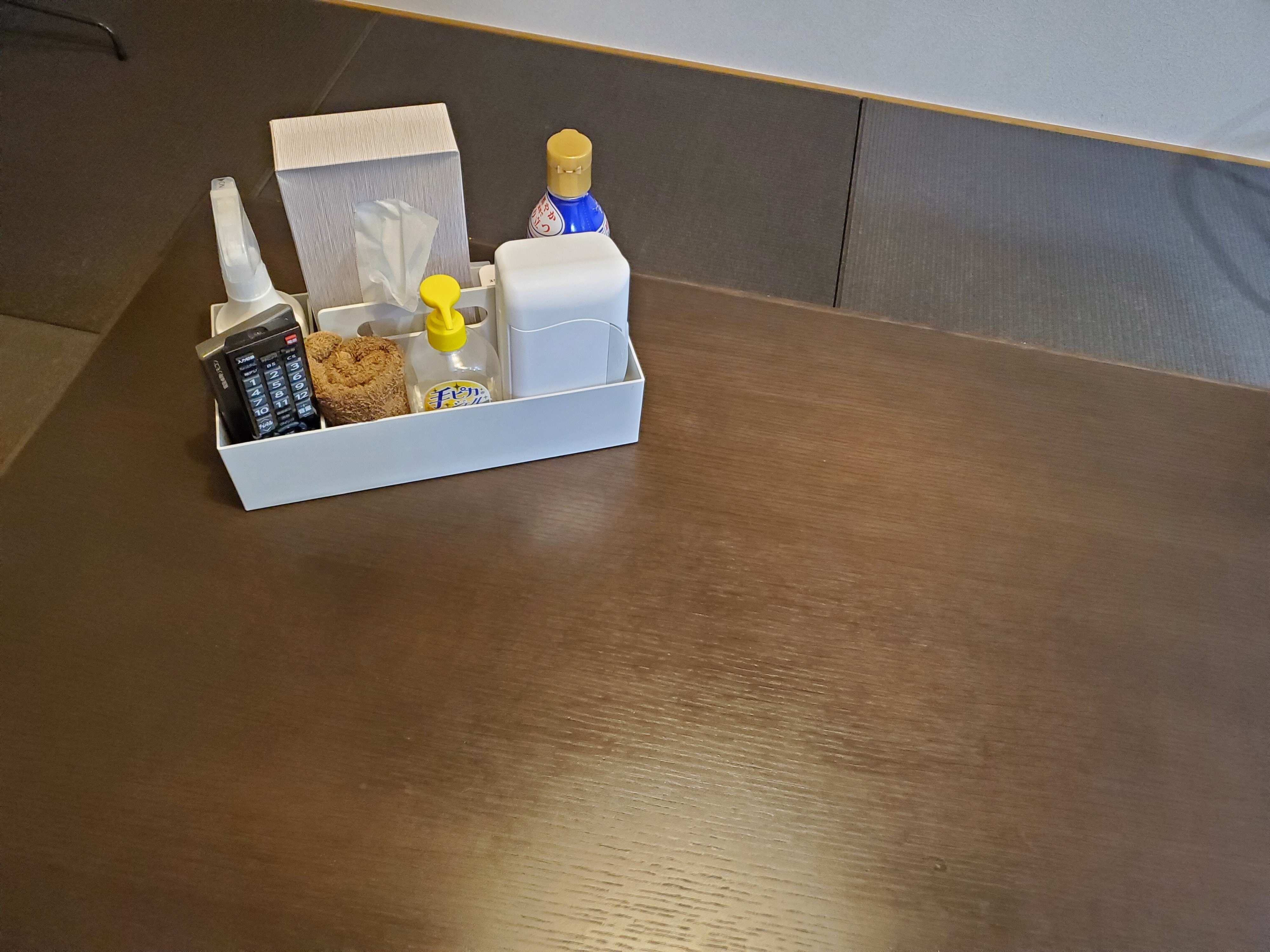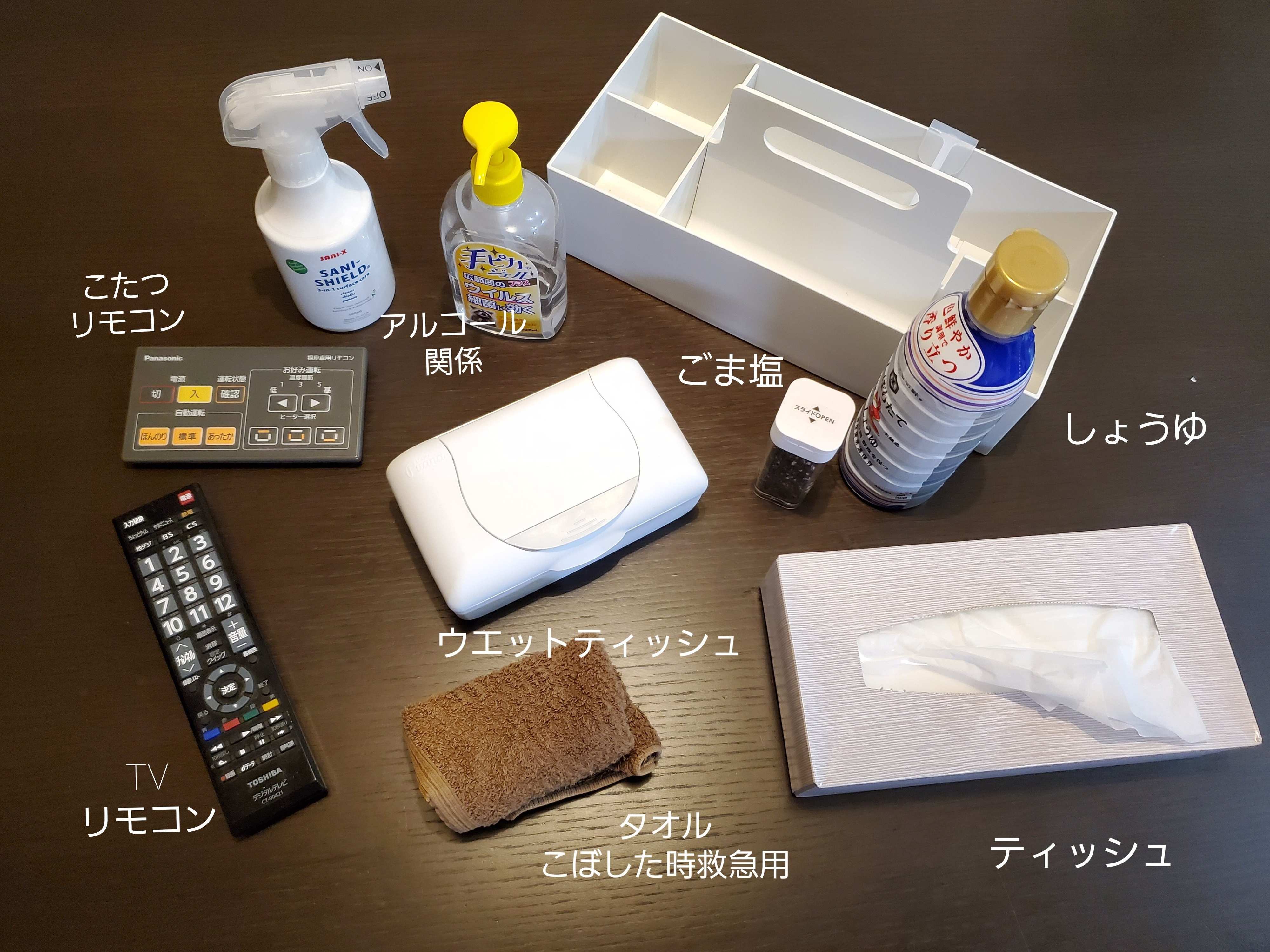テーブルを拭くためのアルコールスプレーや、子どもがこぼしたときにサッと拭きとるためのタオル、子どもがすきなしょうゆかけご飯用用のしょうゆなど本当に使うものだけを厳選しています。