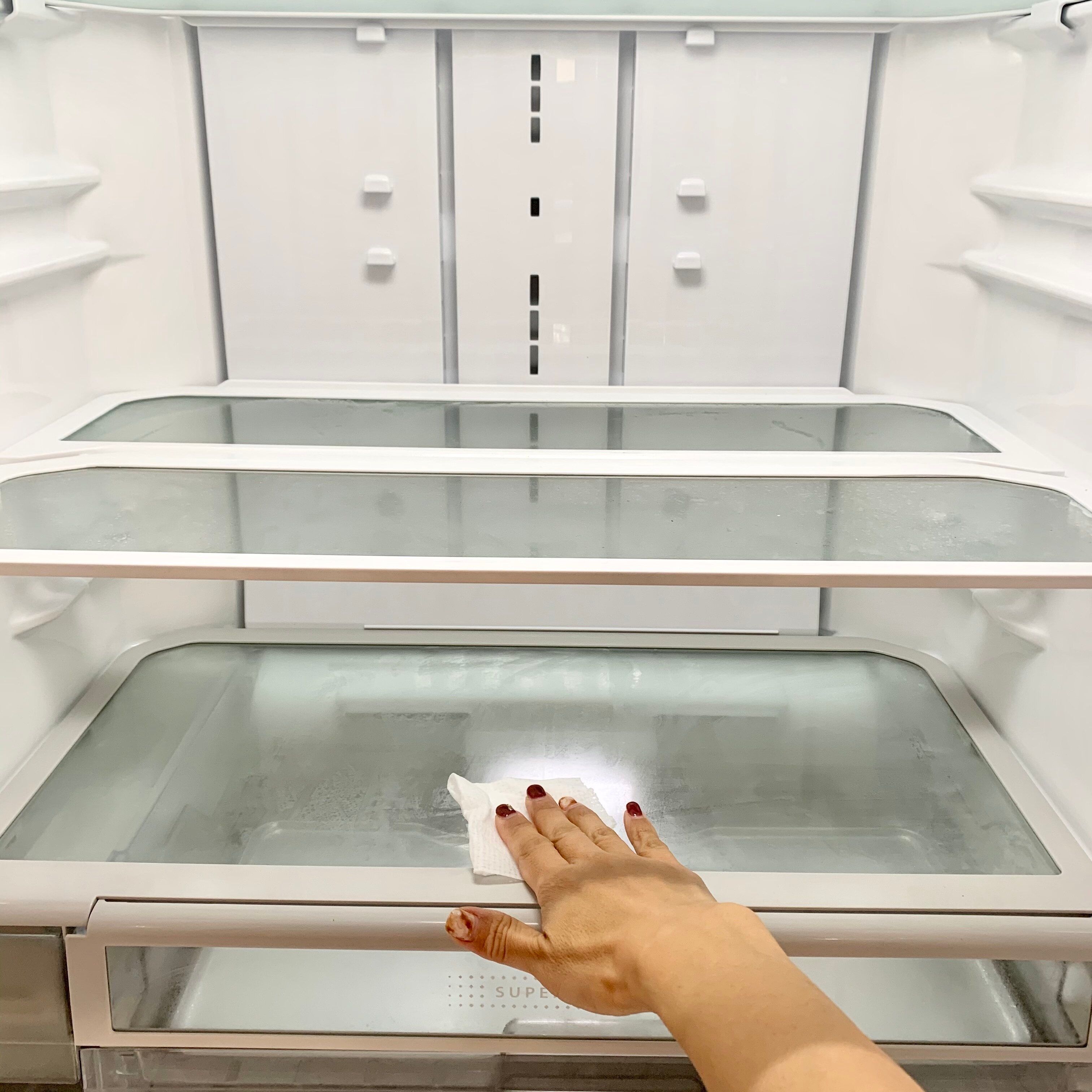 まずは冷蔵庫から全部のものを出して、空っぽになった冷蔵庫をきれいに拭き上げてみましょう。冷蔵庫は食材を収納する場所なので、清潔感を保つことがとても大切です。定期的に冷蔵庫から食材を全出しして、きれいに除菌シートなどで拭き上げることをおすすめします。一気に行うのが大変な場合は、今日は野菜室だけ、明日は冷凍庫だけ、など何日かに分けて行ってみましょう。