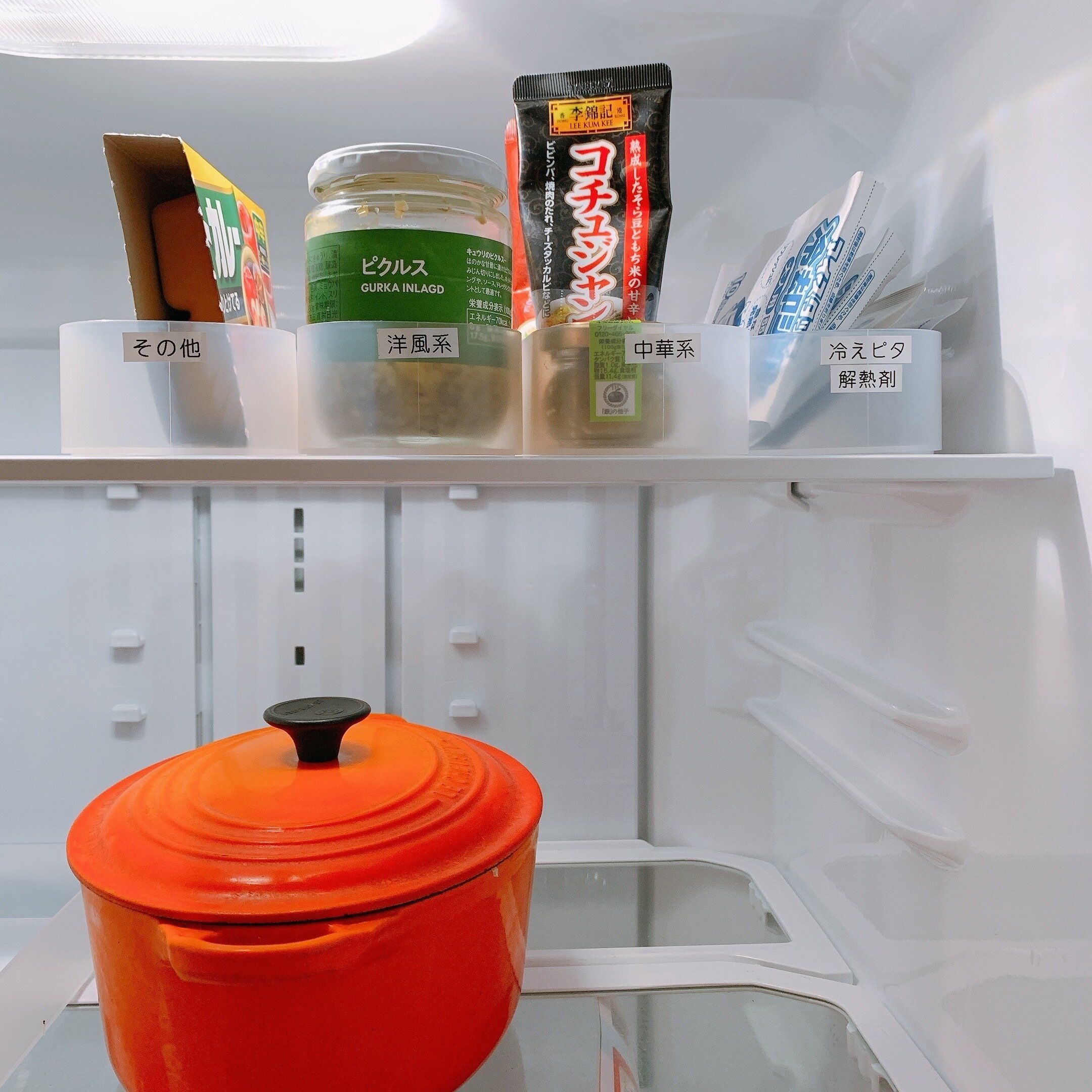 常備しているものには定位置を決めてあげておくと、在庫管理がしやすいですよ。わが家では、納豆、味噌、豆腐、チーズ、おやつ、中華系調味料、洋風系調味料、そのほか冷えピタなどの定位置を決めています。