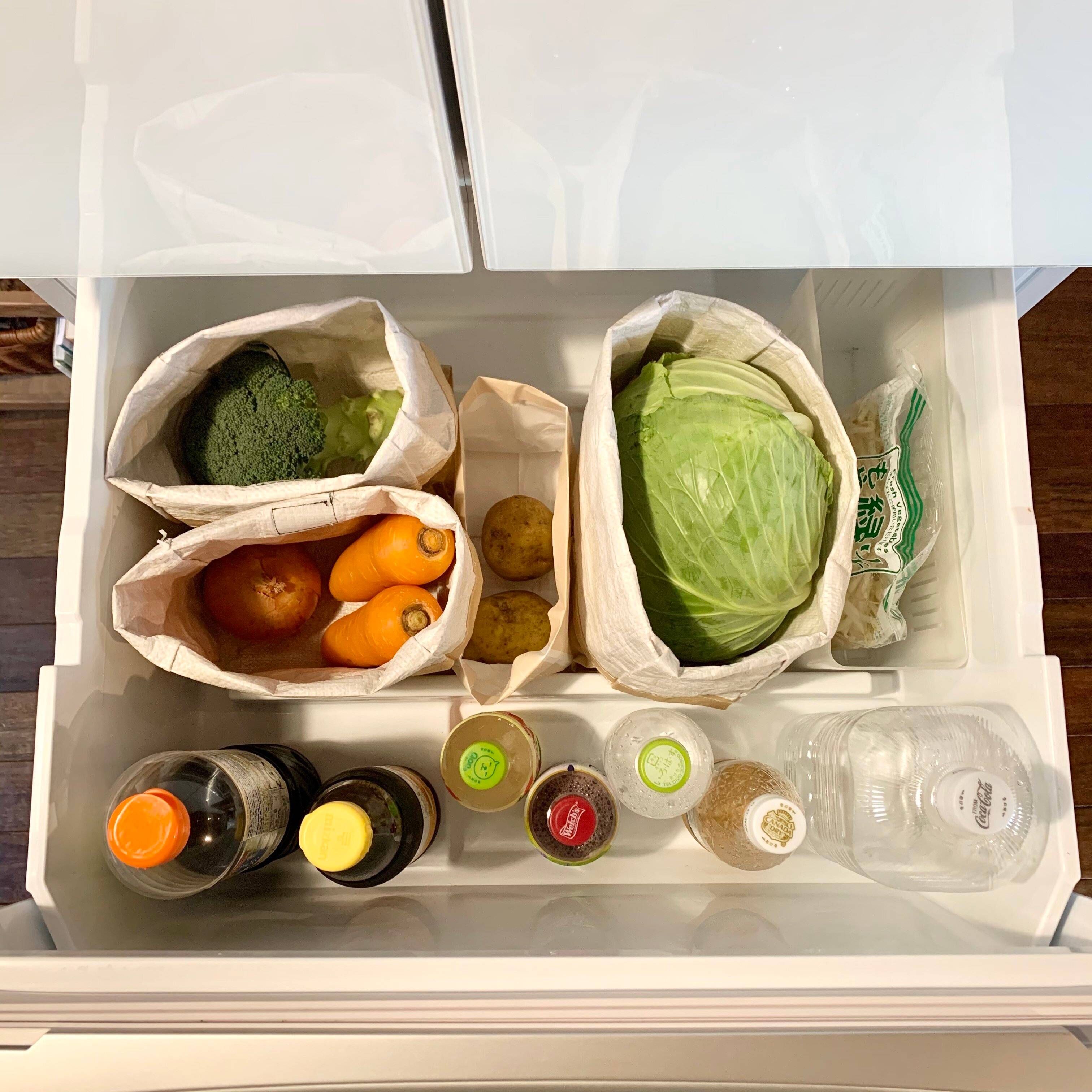 野菜室も紙袋や100均のランチバッグなどで仕切って収納します。ここも大切なのは、仕切りを入れて、上から見ても全部見えることです。