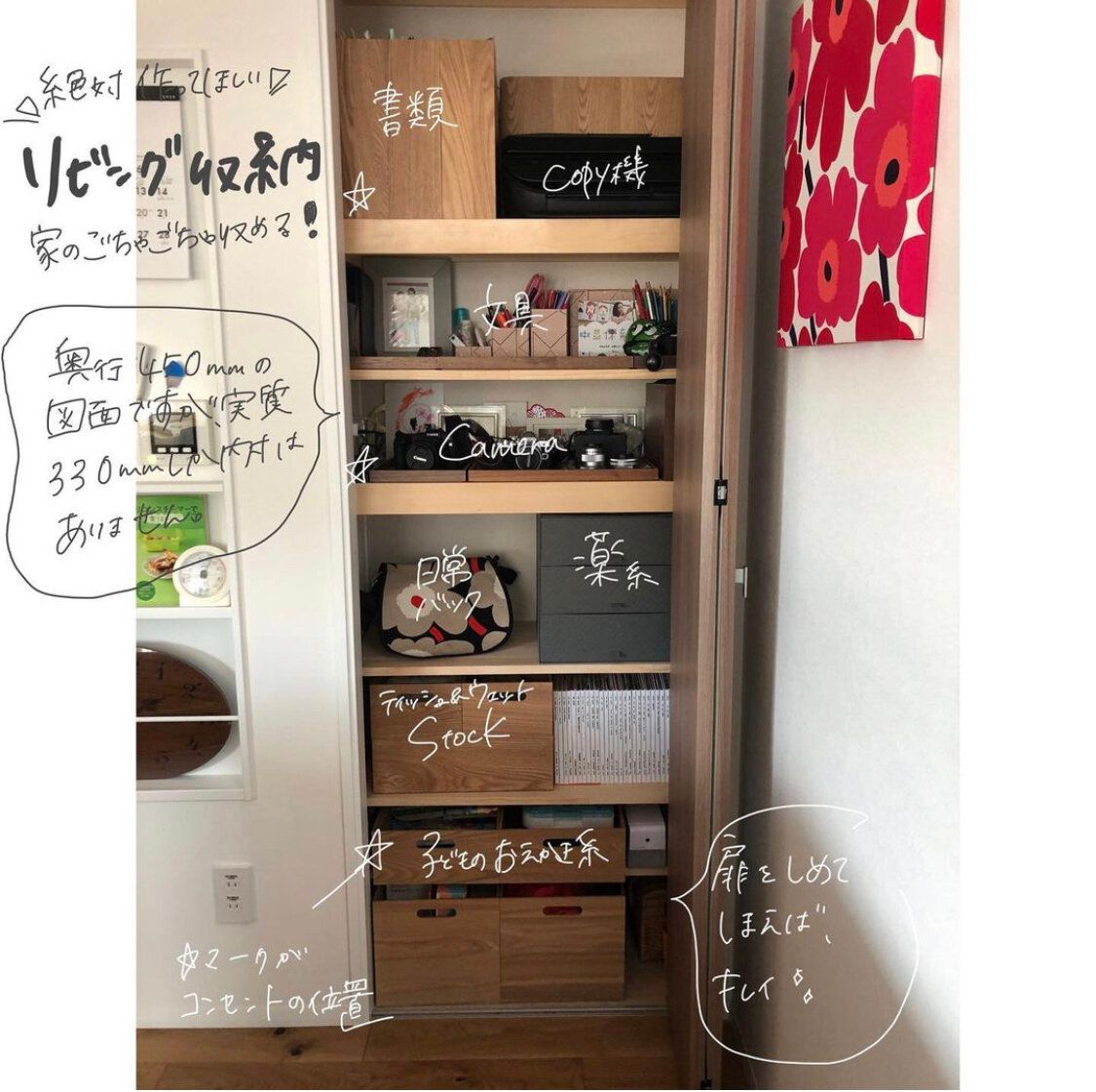 すでにお家を建てている方は、文房具だけでもリビング近くの収納にひとまとめしてみてもいいかもしれません。脱・出しっぱなし!でスッキリとしたリビングを叶えましょう。