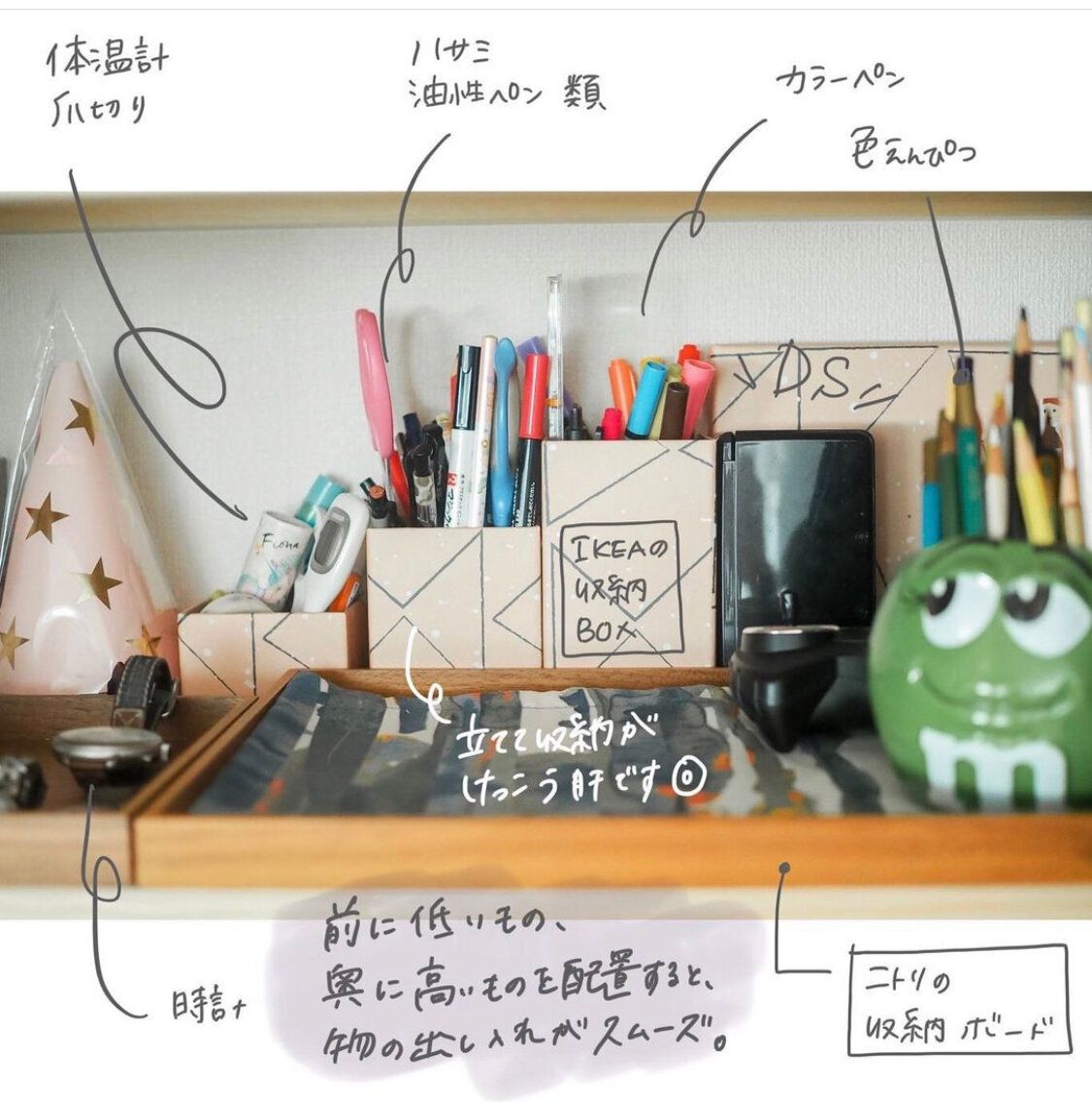 名前ペンや体温計・ハサミなど全て立てています。THEざっくり収納。