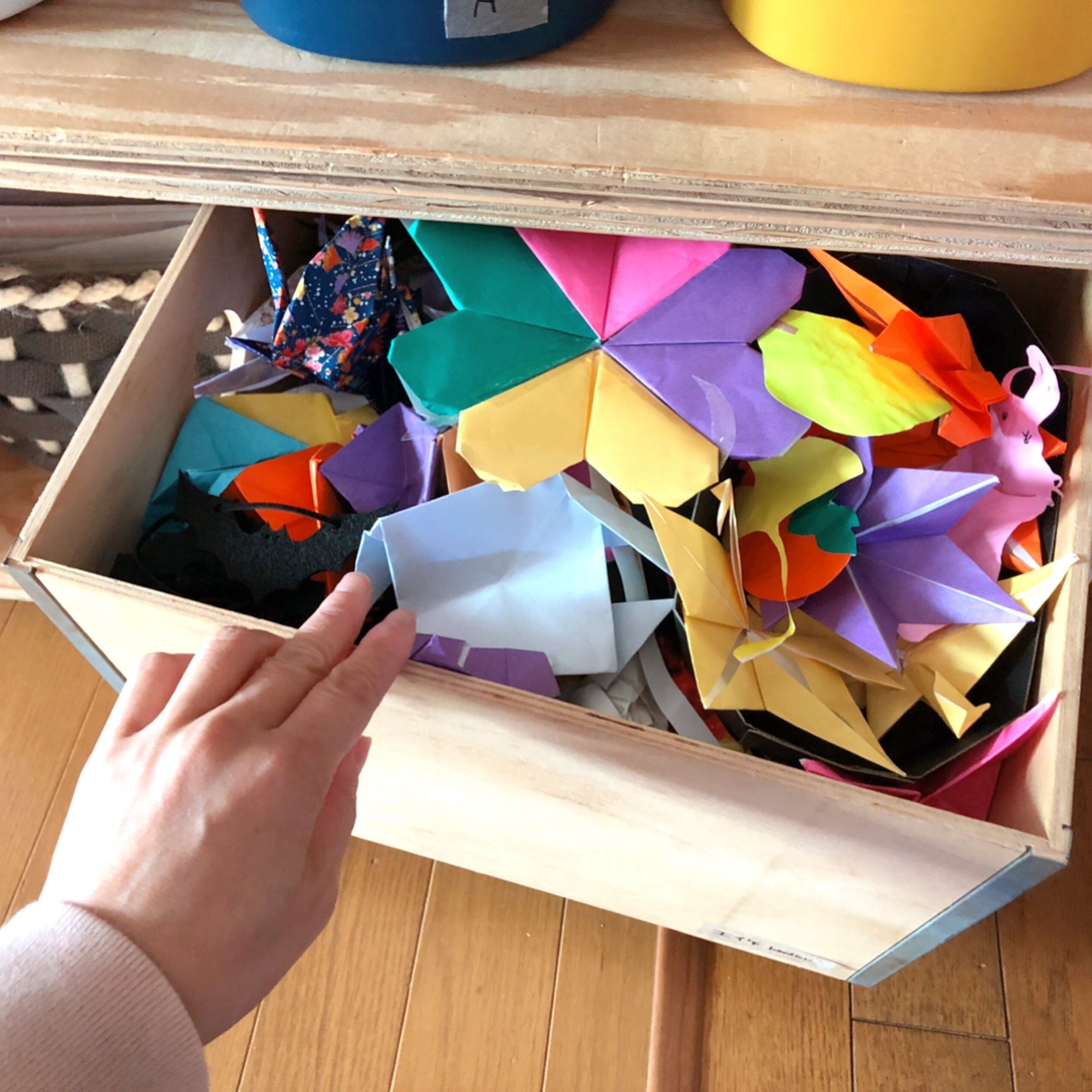何でもボックスというのは、主に工作物を入れておくボックスです。子どもは毎日のように工作をしますが、おおよそは作ることが楽しいようで、作ってしまうとまた次のものへとシフトチェンジしています。本人が気に入っている作品は飾っていますが、それ以外のものは何でもボックスに一時的に収めてしまいます。