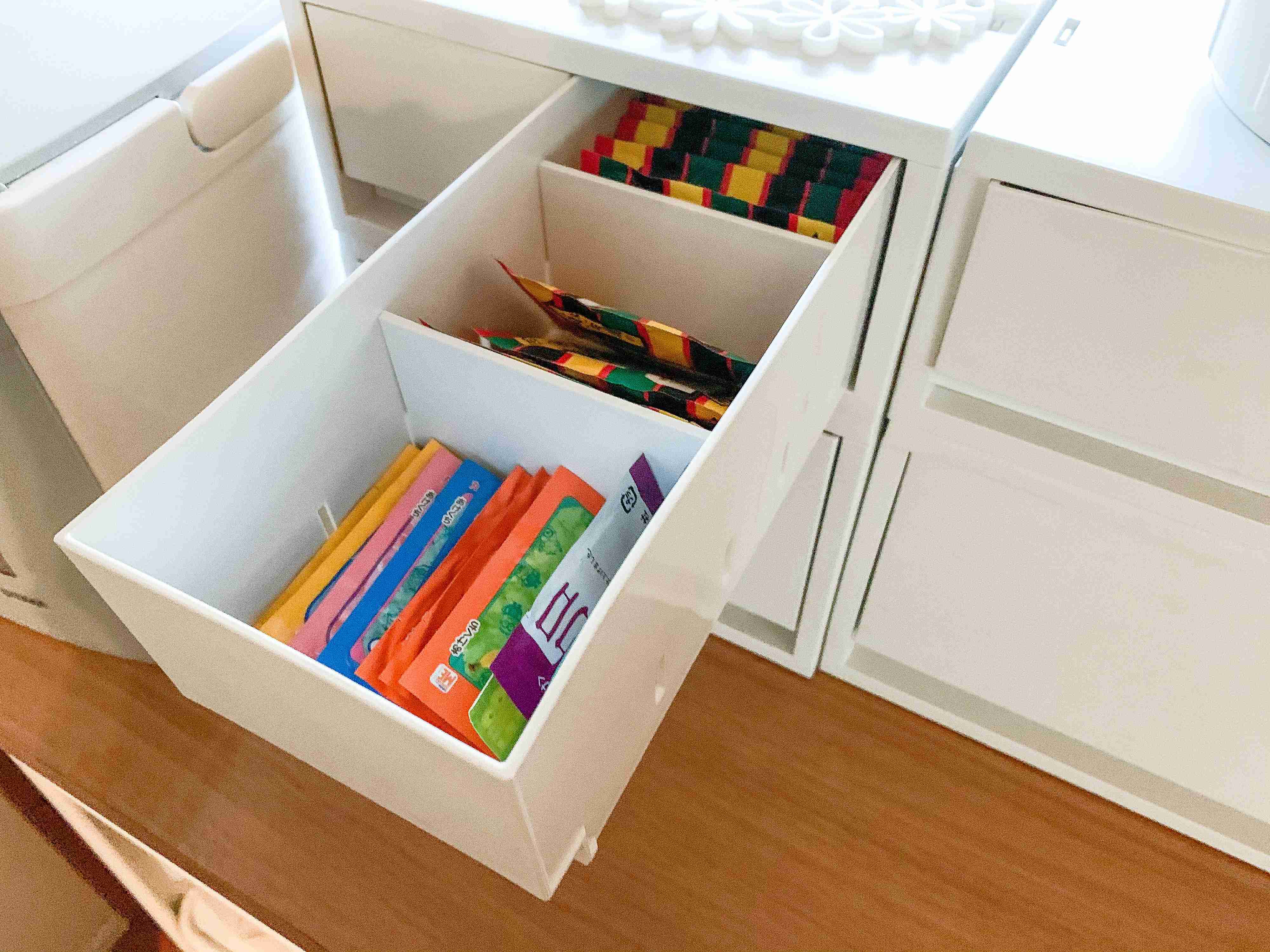 お茶漬けのり、お弁当用のふりかけなど、小分けになっていて、さらに箱や袋に包装されているモノは、はじめに箱や袋から出して、小分けにした状態で片づけるようにしています。