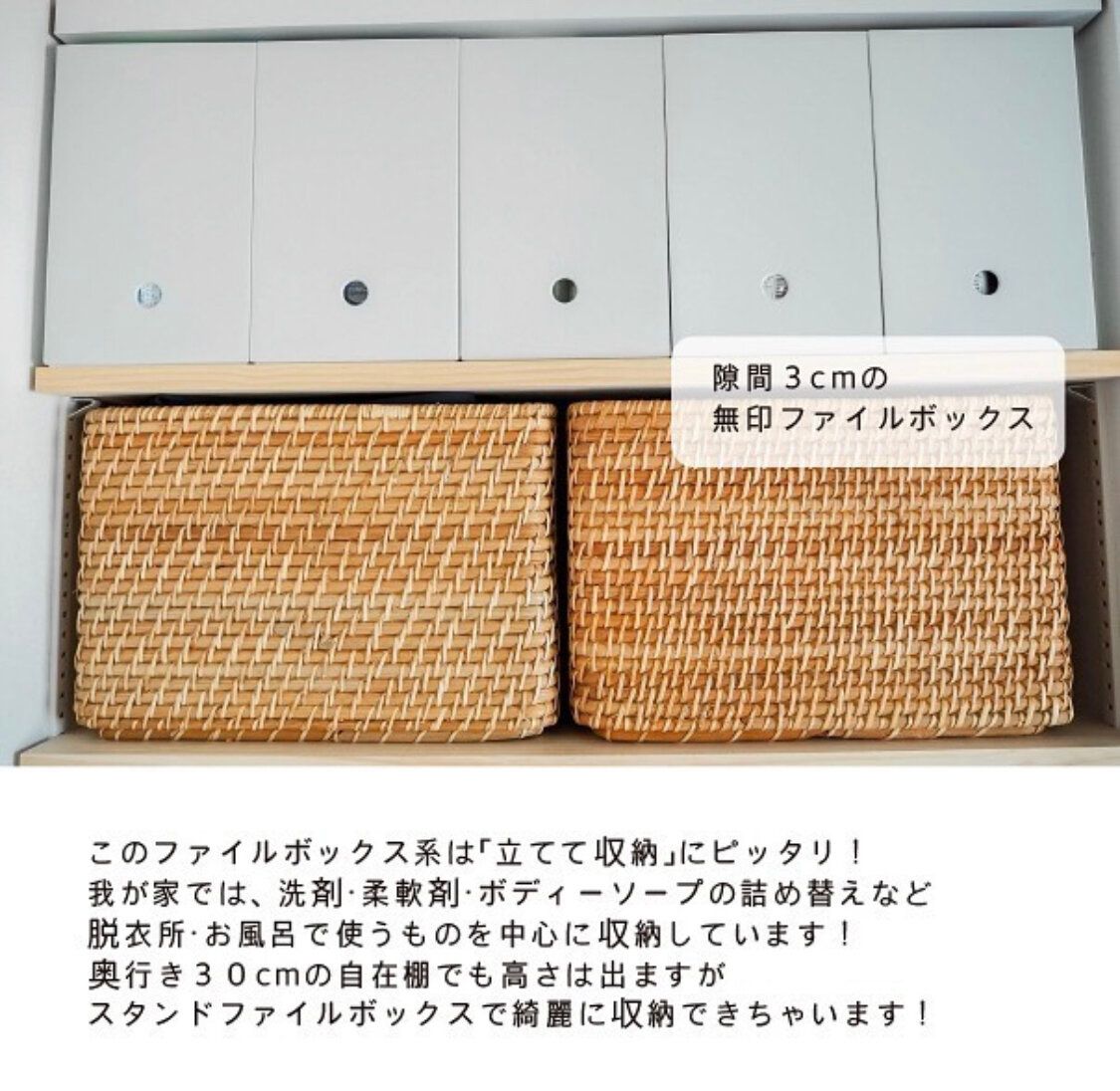 奥行き30cmの収納スペースには、スタンドファイルがピッタリです。※上の写真は奥行45cmの収納スペースなのでファイルボックスを使用しています。