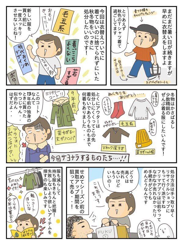 引越し時に、春夏服も着る服だけに減らしたらほんと管理が楽になりまして、買い物もコーデもムダなし、ぐしゃーも減!秋冬物はとくにかさばるし…「捨てるものの4つの基準」を作り、それに当てはまったら処分と決め取り組みました。