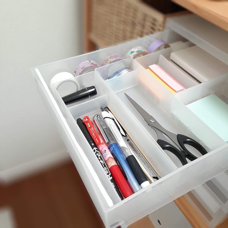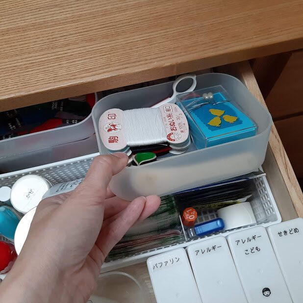 裁縫箱と同じく薬類もボックスに収納していましたが引出し収納に変えました。常備薬はセリアの常備薬ケースに収納し、他も仕切りを付ける事で使いやすくしています。ボックスで使用していた時よりもアクション数が減ったので家族が使用しても元に戻してもらいやすくなりました。薬にも使用期限があるので定期的にチェックして見直しています。病院で処方されたお薬は基本飲みきるのでこちらとは分けています。冷蔵庫の側面にマグネットで付けて飲み忘れを防止しています。