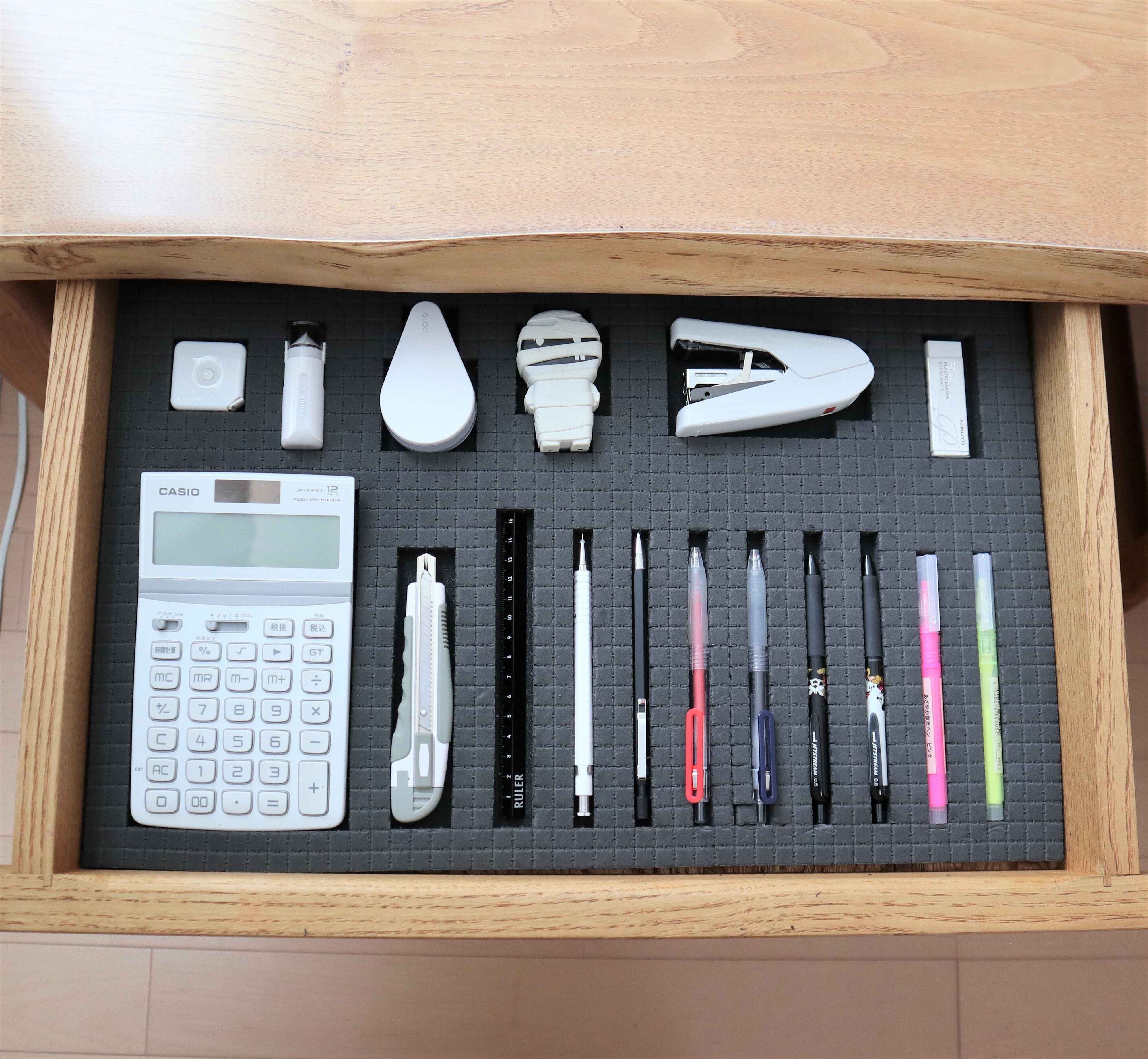 在宅ワークのデスクや子ども用デスクなど、机1つですべて完結されたいかた、数があまりないかたにはこちらの収納がおすすめです!お気に入りの文房具を必要なサイズにくり抜くだけで、唯一無二の文房具収納の完成です。でき上がりをイメージして配置を決めてから、くり抜きましょう。