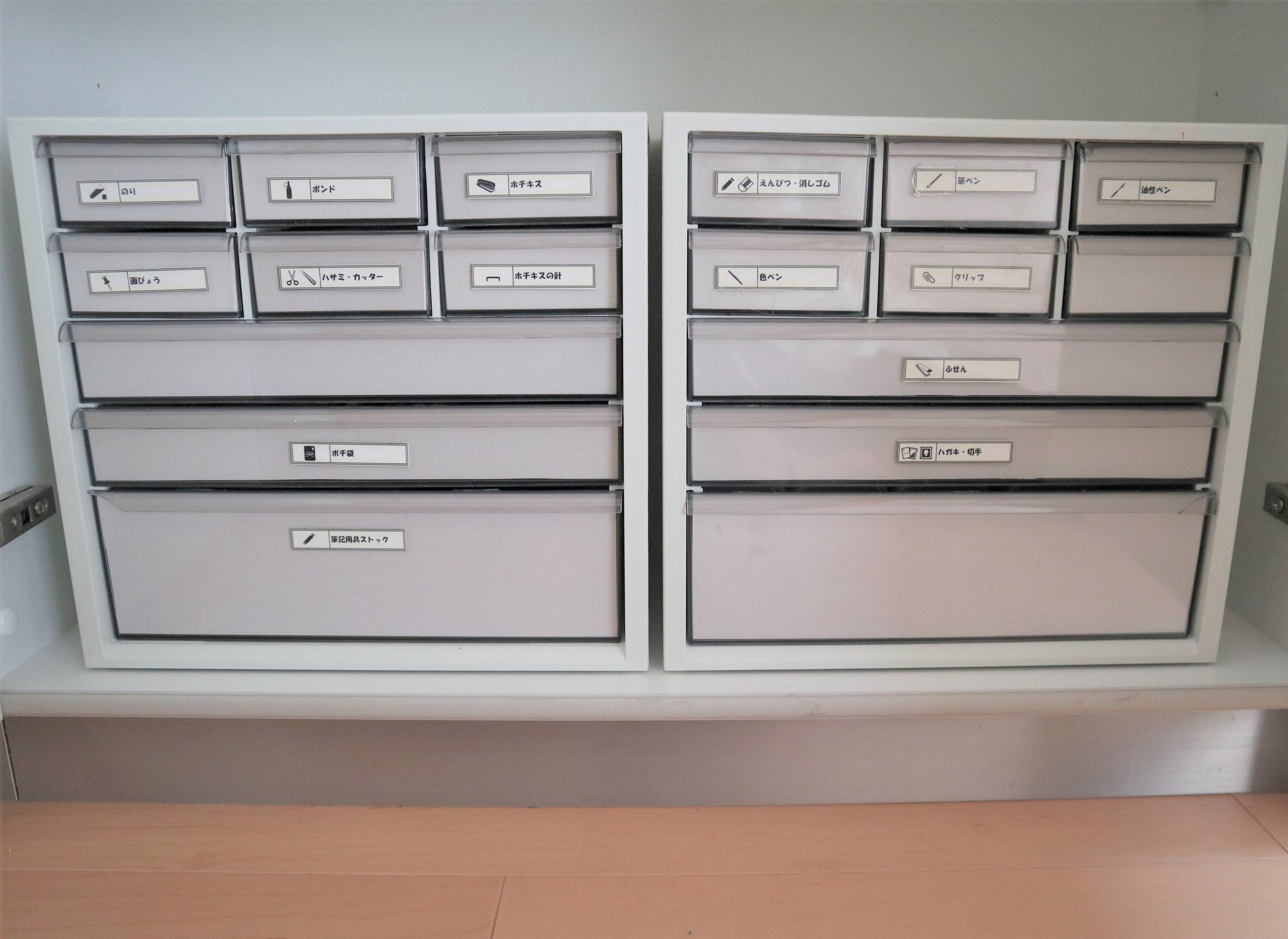 収納したいものが決まったら、仕切りトレイでそれぞれの部屋をつくります。そして、手間ですが家族みんながわかるようにラベルを必ず貼りましょう。マスキングテープに手書きでもOK。このときたくさんのものを1つのトレイに入れたいところですが、できるだけ1つのトレイに1アイテムを入れるようにしてください。