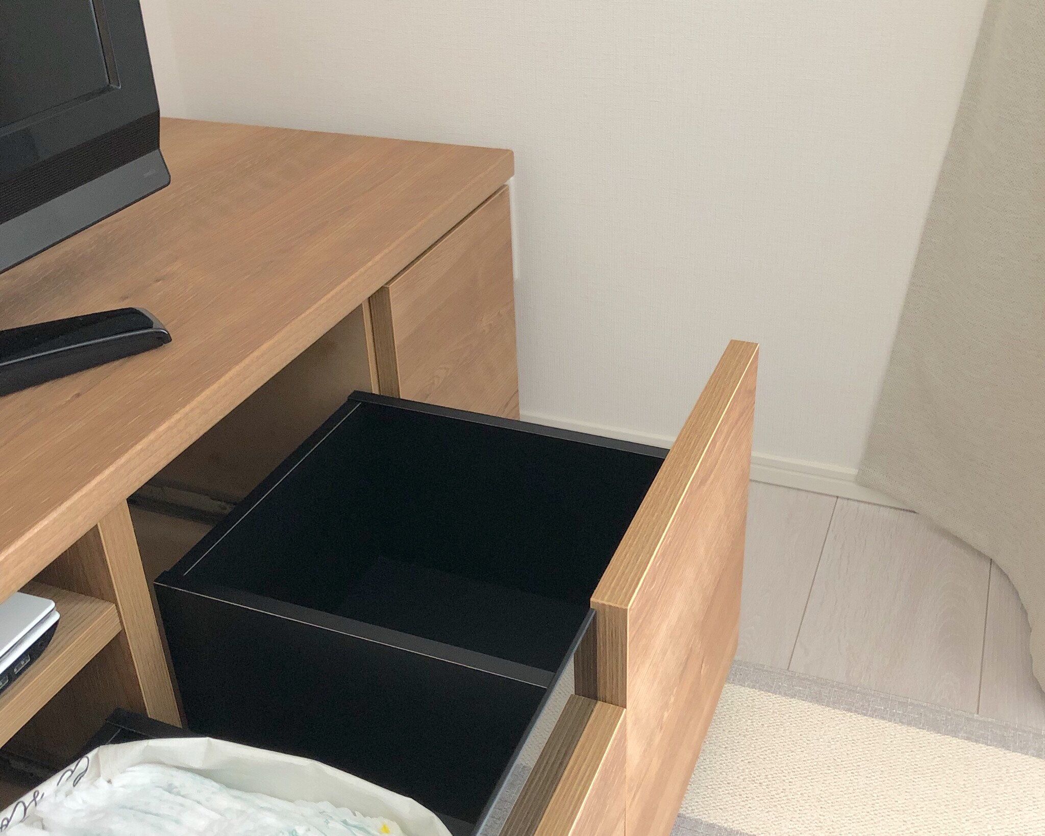 テレビボード収納。無理にスペースを埋めず、必要のない時は空けています。