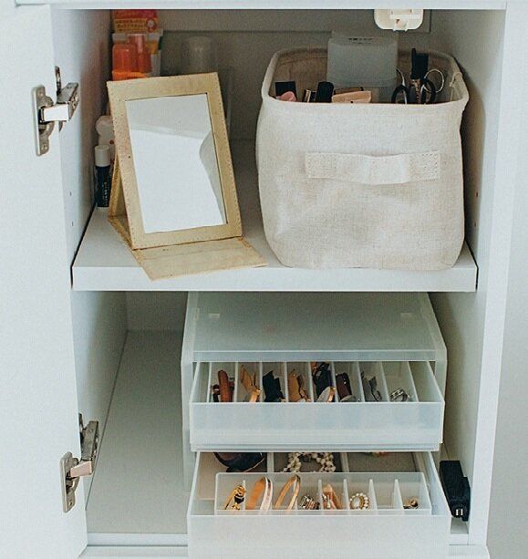 コスメとアクセはリビングの一角にある棚にまとめてIN。