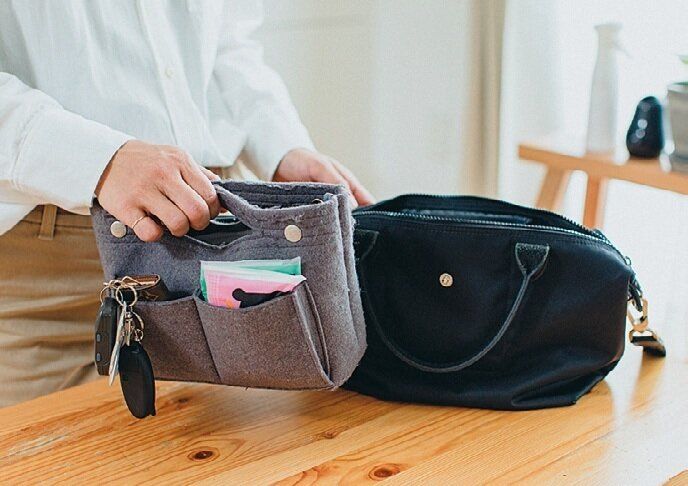 どのバッグのときも持ち物を同じにできるように、バッグインバッグに必需品をIN。中身を入れ替えるだけの「やどかり作戦」で忘れ物とは無縁に。