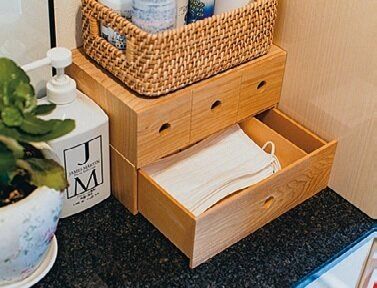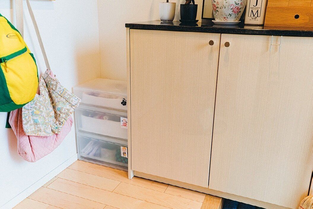 出がけに「忘れた!」となりがちな子どものマスクやハンカチ、出発直前にはく靴下。まとめて玄関に置いた引き出しにしまえば、室内に戻らずにすんでラク。
