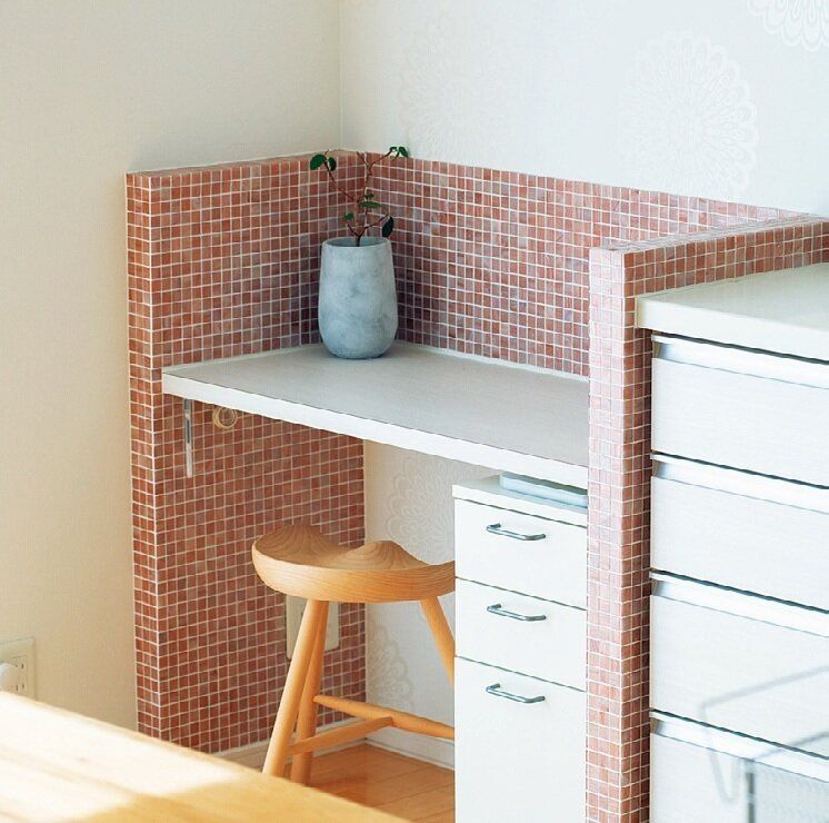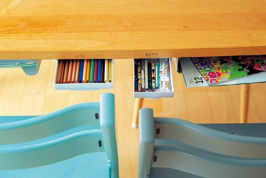 ここでお絵描きや宿題をする子どもたち。テーブル裏にファイルボックスとペンケースを貼りつけたら、使用後に「片づけて」と言わなくても、自分で戻してくれるように。