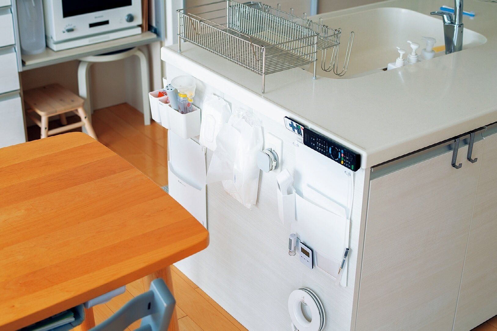 キッチンカウンターの側面には、毎日必ず使う物をまとめて貼りつけ。テレビのリモコンも、裏面に面ファスナーをつけて、簡単に着脱できるようにしています。