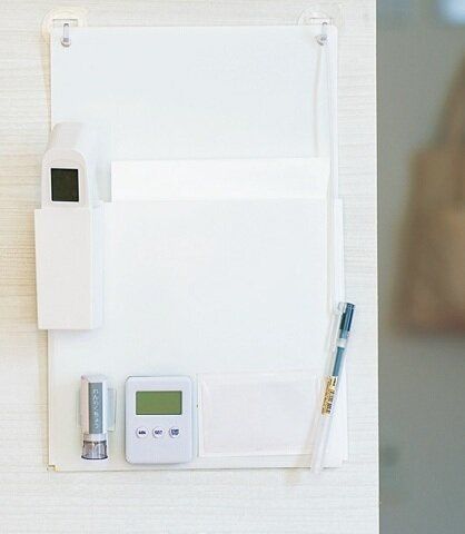 子どもたちは毎朝検温して学校に提出が必要。体温計とプリント入れ、ペン、裏面にマグネットをつけた印鑑をひとまとめに。