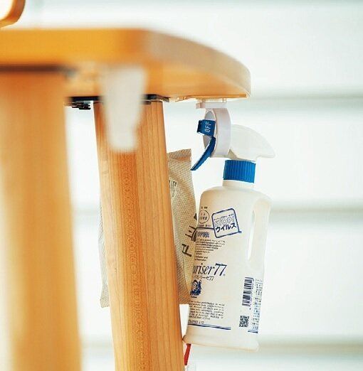 100均の「傘ホルダー」を逆さにして、アルコールスプレー掛けに。「頻繁にテーブルを拭くので必需品ですが、テーブル下なら、出しっ放しでも目立たないし、サッと取れてラク!」。