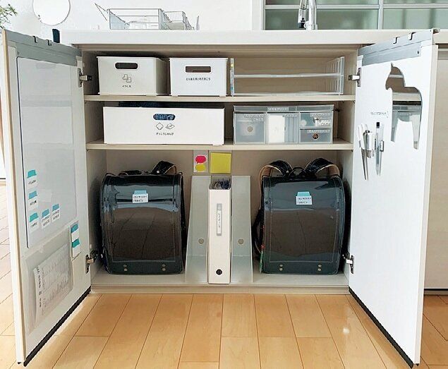 ランドセル置き場の収納スペース。扉の裏にマグネット板を貼り、数字をラベリング。はさみやペンにもそれぞれ番号をつけることで、子どもが「つい戻したくなる収納」に!