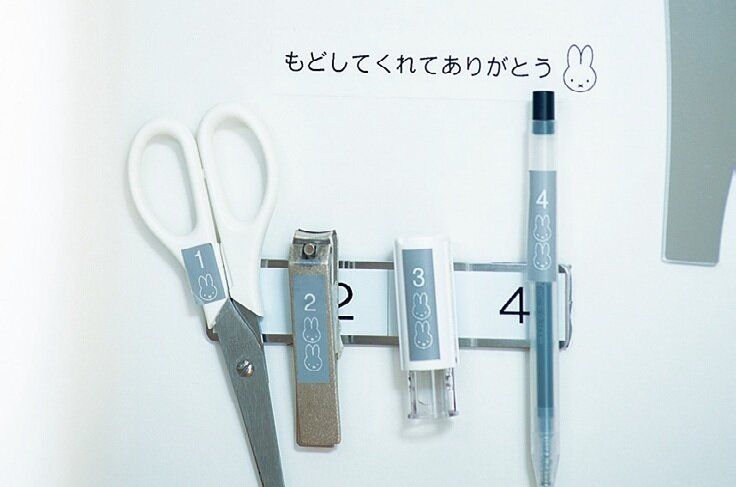 - 子どもが使うはさみ、ペンは、数字ラベルで元に戻しやすく