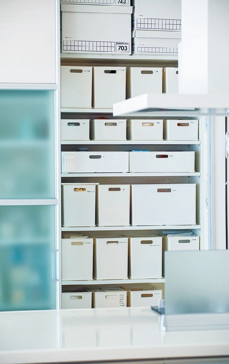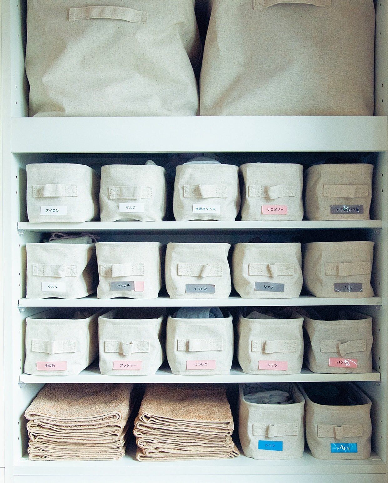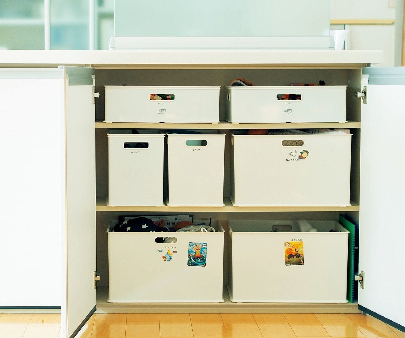 収納スペースに合わせて、同じケースで仕切ることで、見た目が整い、出し入れもラクに。 中身が見えないケースにはラベルを貼って、必要な物がすぐ探せるようにしています。