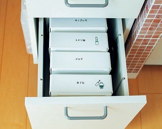 袖机の引き出しの下段には、たまに使うネイルやアクセサリーなどを道具箱に収納。「立てておけば、必要になったとき見つけやすく、箱ごと取り出しやすい!」。