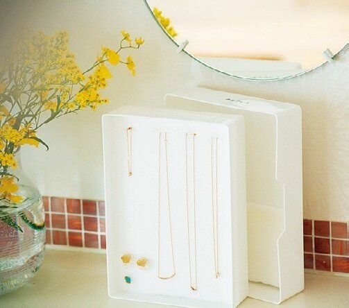 道具箱にカットしたメラミンスポンジを収め、切れ目を入れて、ネックレスやピアスを差し込むだけ。からみにくく、見た目もキレイ!