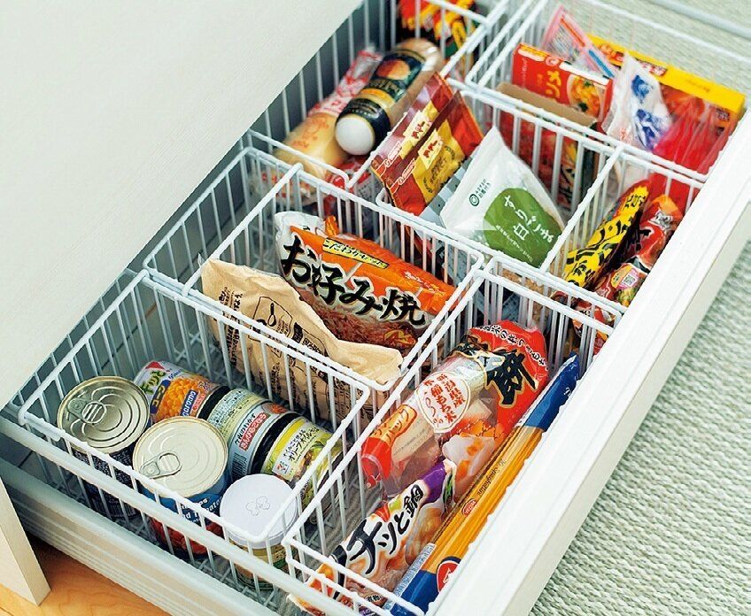 サイズや形がバラバラな食品ストックは、仕切りの位置が自由に動かせるワイヤーカゴで分類。「パッケージが見えるように立てて入れれば、簡単に在庫チェックできます」。