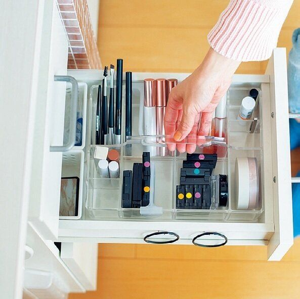 毎日使うメイク用品は、袖机の引き出し2段目に。クリアーケースで分類し、アイシャドウの側面には色分けシールを。「いちいち開けなくても、使いたい色がすぐ選べます」。