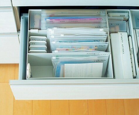 「深さがある引き出しは、重ねて入れると、いちいち動かすのが面倒なので立てて入れるのがマストです!」。ラベルやシールで、中身がすぐわかる工夫もプラス。