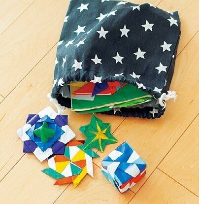 折り紙好きな二男。「細々した作品はきんちゃく袋に収納するように。あふれてきたら、二男に確認して古い物を捨てています」。