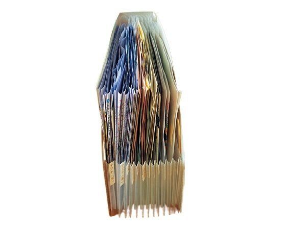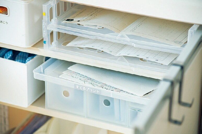 青=長男、黄色=二男で色分けしたプリント置き場。帰宅後ここに出し、akiさんが毎日確認して捨てる物は下のトレーに。保管が必要な物は蛇腹ケースに移し、1年たったら長期保存の物以外は処分。