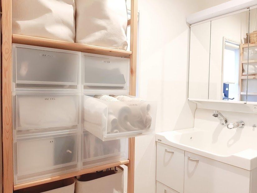 私と娘たちはバスタオルを使っていません。お風呂上がりに使うのはフェイスタオルを1人1枚。フェイスタオルだけでも十分だということが分かったので、収納スペースも乾かすスペースも節約することができます。ただ、夫はどうしてもバスタオルを使いたい人なので、夫用に3枚だけあります。消耗したら入れ替えてケース1つで管理。これ以上増やさないようにしています。家族の意見も取り入れ、今はこれで折り合いをつけています。