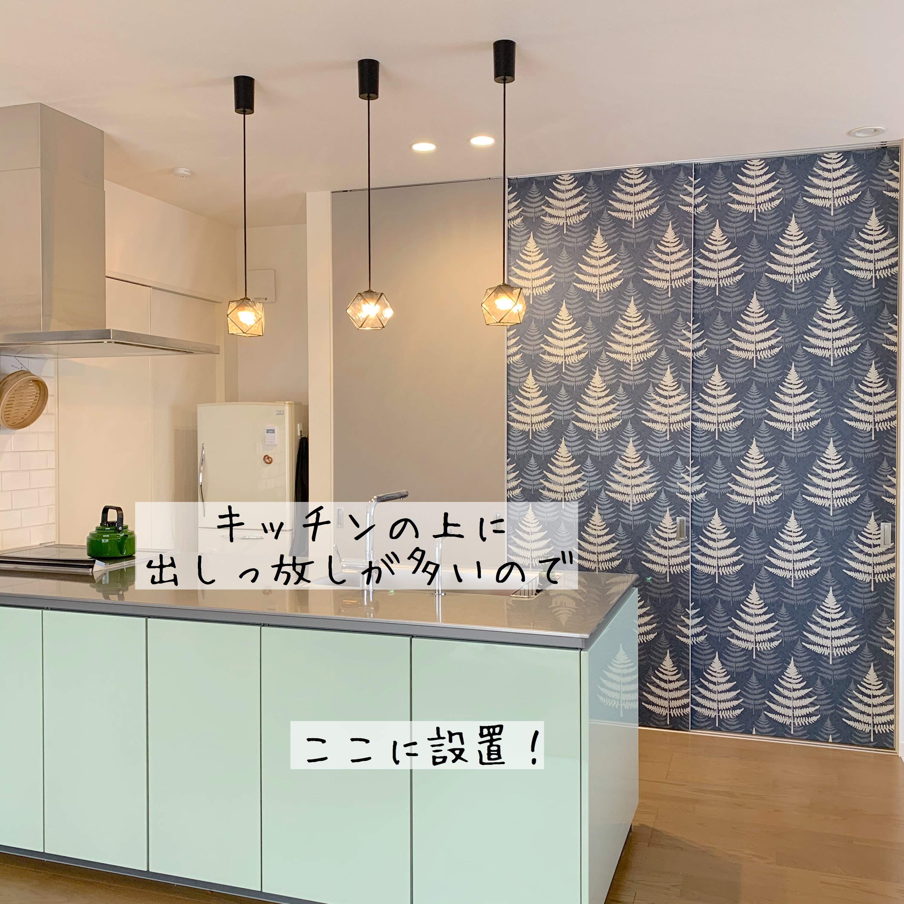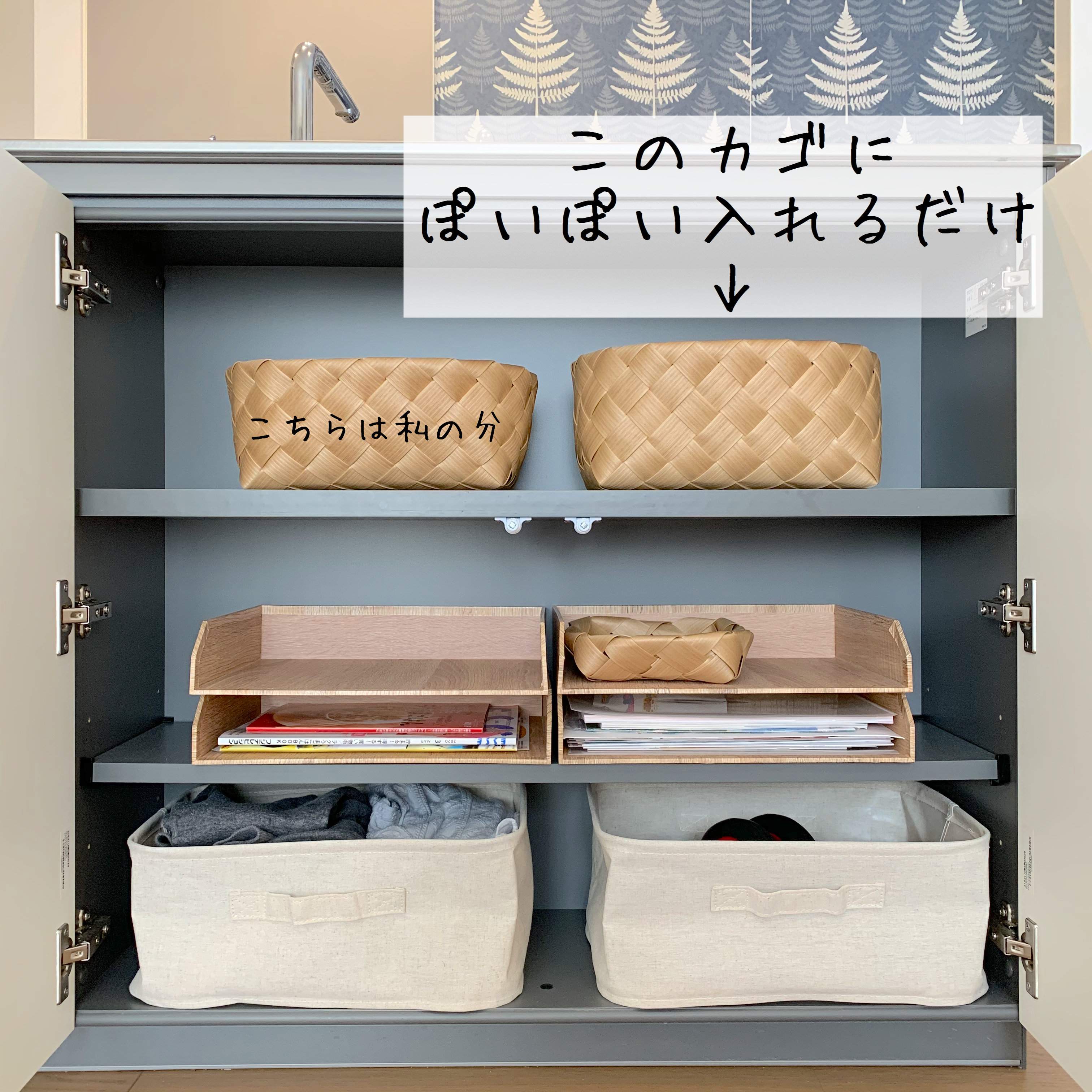 キッチンはカウンターのリビング側の収納に「とりあえずbox」を設置しました。扉を開けるだけ、しゃがまなくてもよい高さなので、入れるストレスはありません。ぽいぽい入れるだけで、扉を閉めればすっきりします。