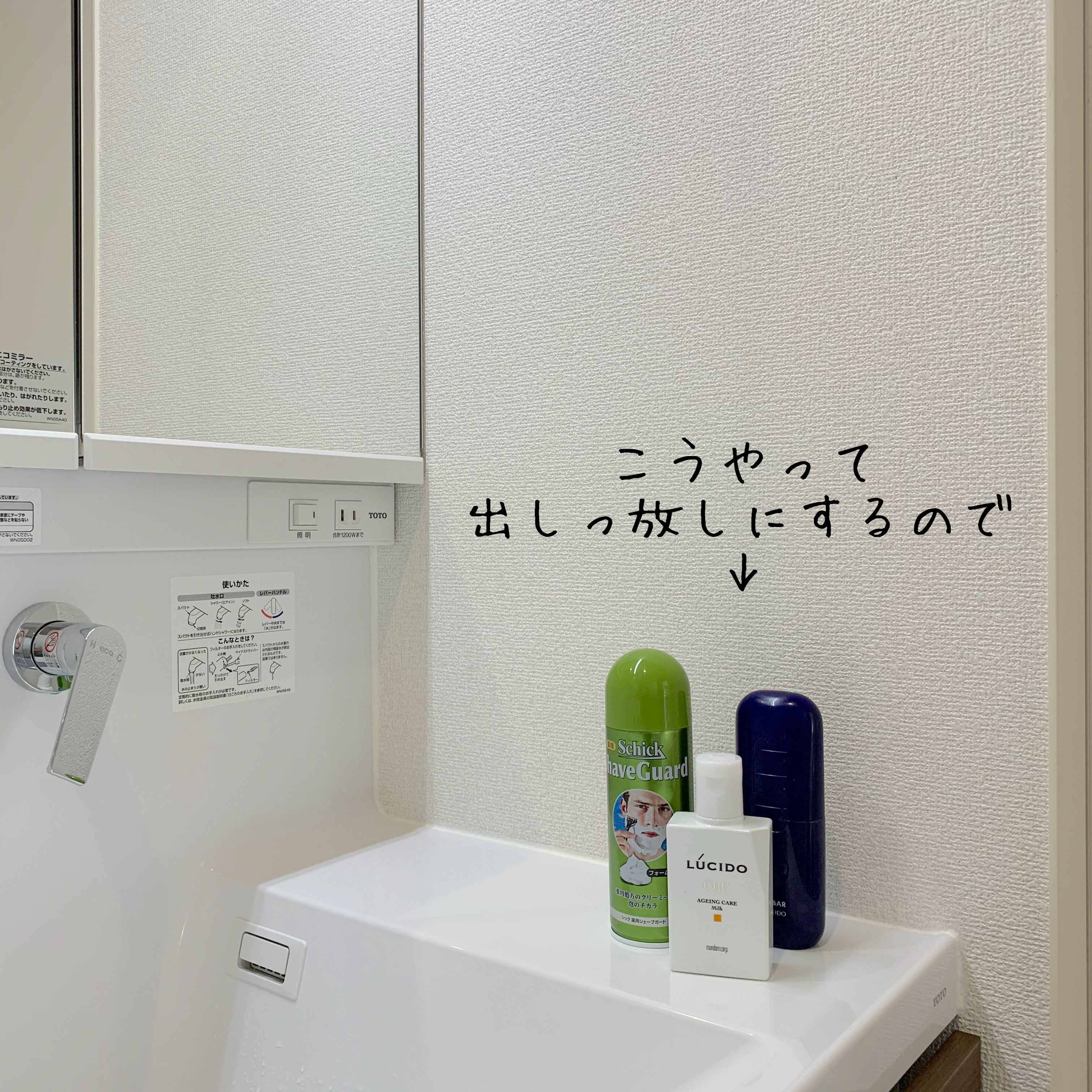 また、洗面台は鏡裏に夫用のスペースがあるのですが、夫はそこに片づけることができず、洗面台の上に整髪料やシェービングフォームを出しっぱなしにしてしまいます。