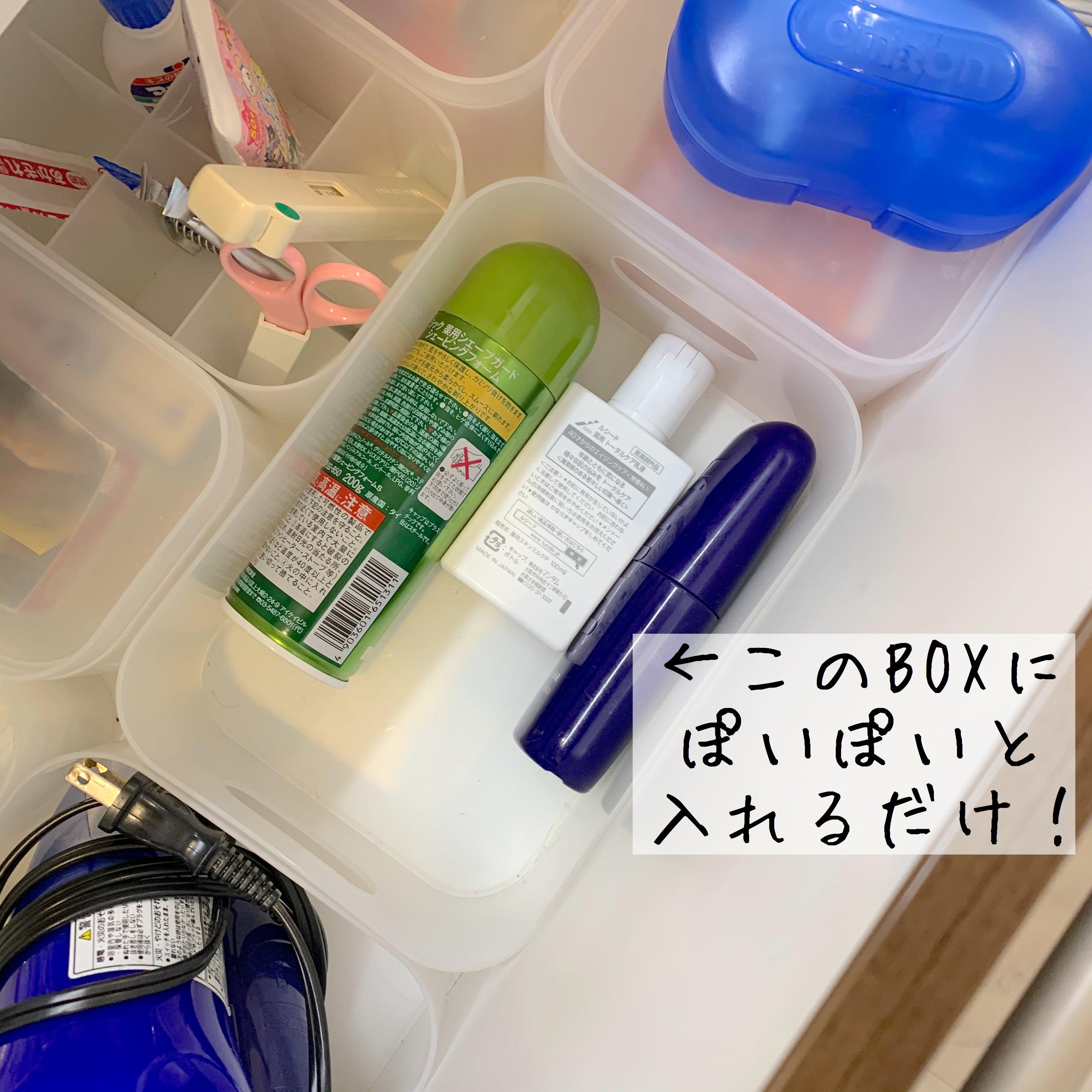 夫は探しものがあると「とりあえずbox」の中を探します。ここを探せばある!と分かっているので、「アレどこ?」と聞かれることがなくなりました。「どこ?」と聞かれるのも、ちょっとしたストレスだったのでうれしい効果です。