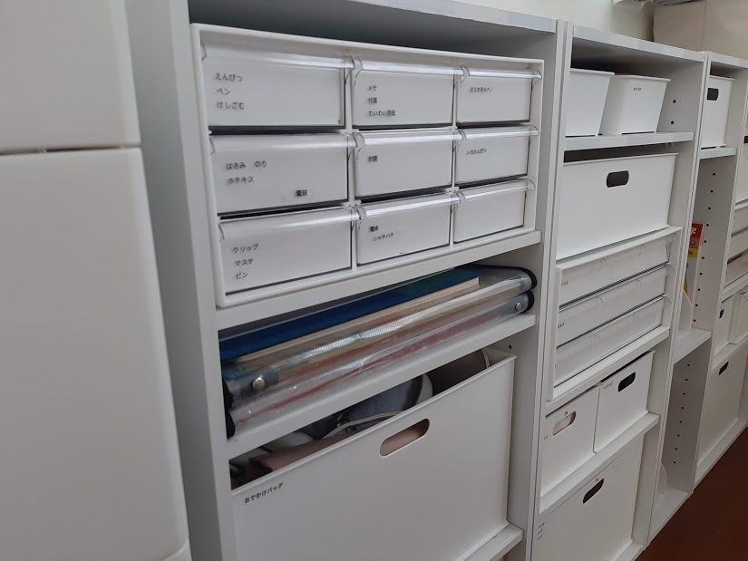 毎日使うかばん類や細かなもの、子どもたちが書いたお絵かきや何となくつくった作品の住所も予め決めておきます。
