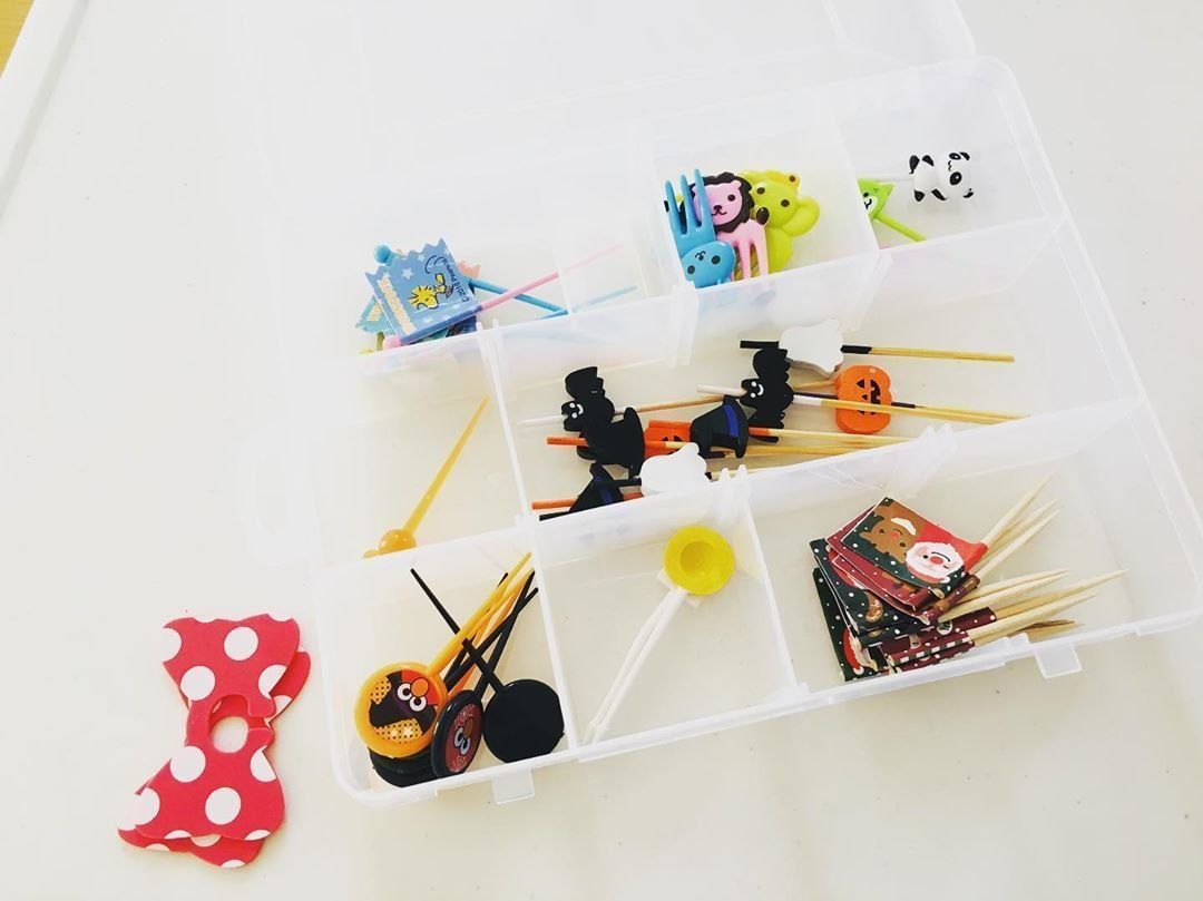 子どものお弁当用のピックは、数種類そろえているという方も多いのではないでしょうか。まとめて収納すると取り出しにくいので、100均の仕切りケースを使って細かく分類。どこに何があるか一目瞭然で取り出すのもラクラクです。