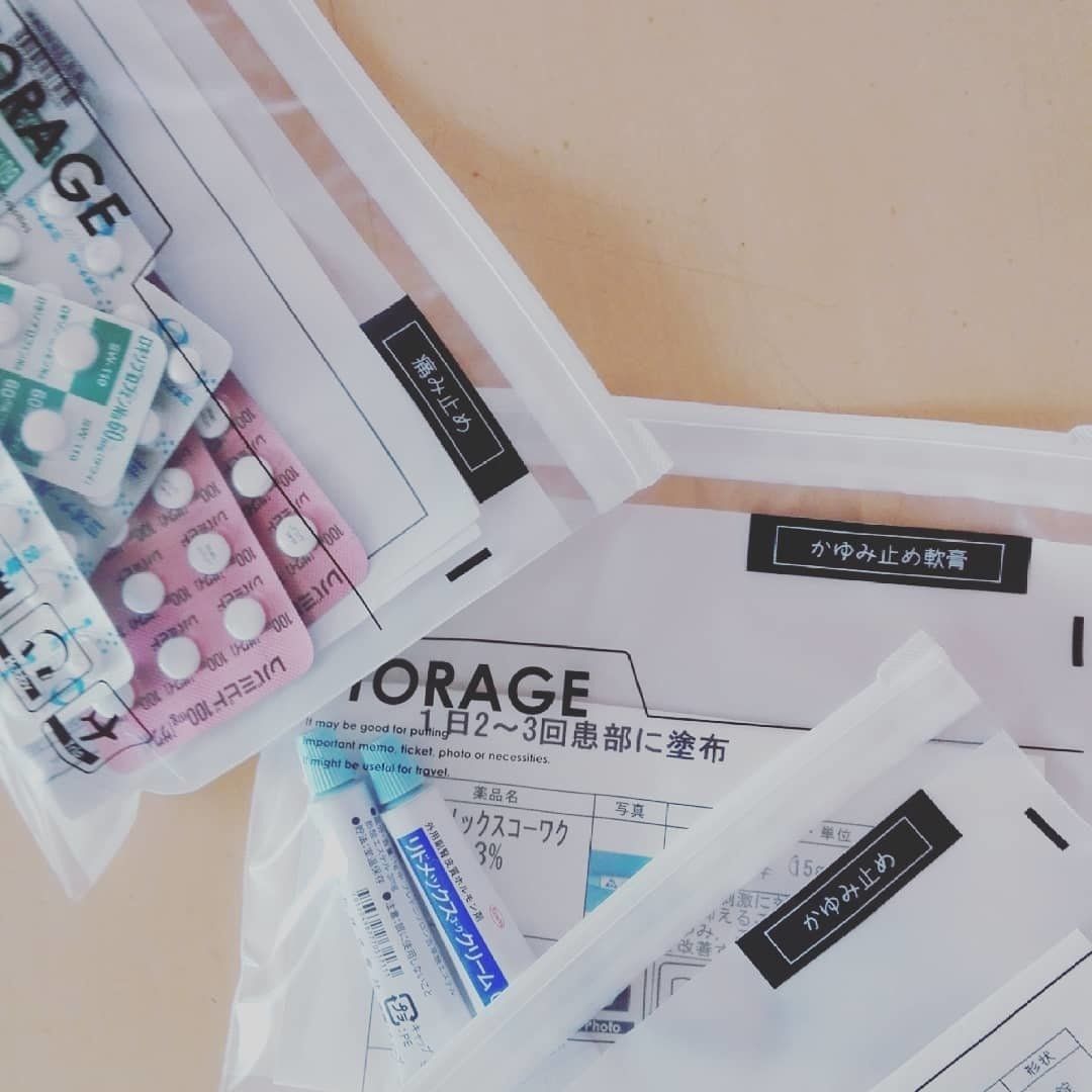 飲み薬や軟膏など、薬類は箱から出したほうが省スペースで収納できます。こちらはダイソーのスライダーパックで種類ごとに収納している実例です。すっきりわかりやすくていいですね!