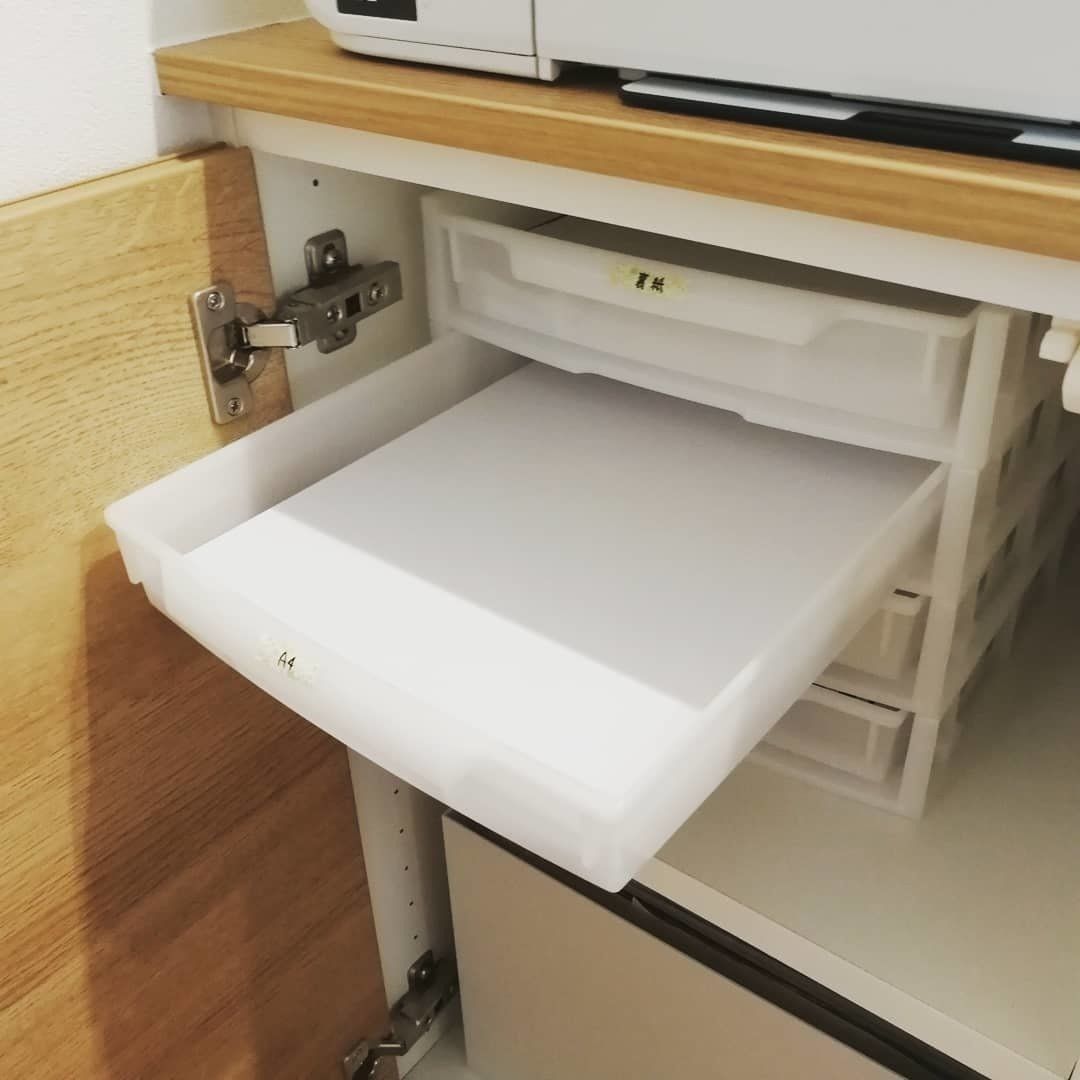 モノは使う場所の近くに収納するのが鉄則!こちらはコピー用紙をコピー機のすぐ近くに収納している実例です。ダイソーのA4ジョイントトレーとジョイントラックを組み合わせて使っています。