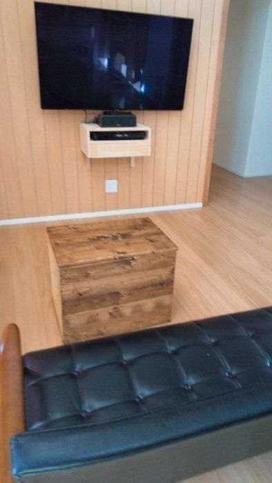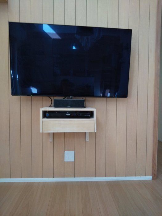 テレビの買い替えをきっかけにテレビ台を処分し、壁かけタイプにしました。テレビ台に収納していたレコーダーを置く場所が必要だったので、夫が手作りした台で浮かせて収納するスタイルに変更しました。