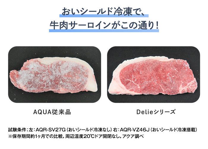 AQUAのDelieシリーズは、霜取り運転時、暖気が冷凍庫内に入るのを防ぐしかけが満載。食品のおいしさを、約-30℃の冷気で一気に閉じ込める「おいシールド冷凍」、霜の原因となる温度変化を抑えて霜がつきにくくする「ドリップ抑制機能」で鮮度を1カ月保持。冷凍食品のおいしさを長期間キープすることに成功しました。