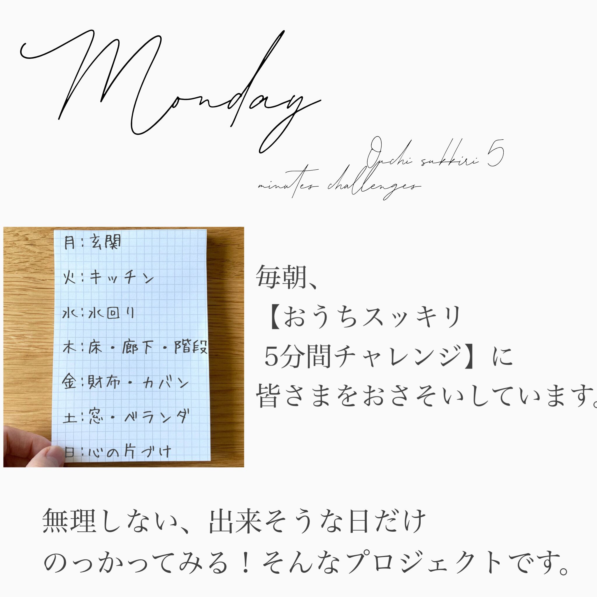 おうちをすっきりさせるためには、日々ちょっとずつでもコツコツ整えていくことが欠かせません。曜日の漢字や順番などから連想して場所を決めてみました。