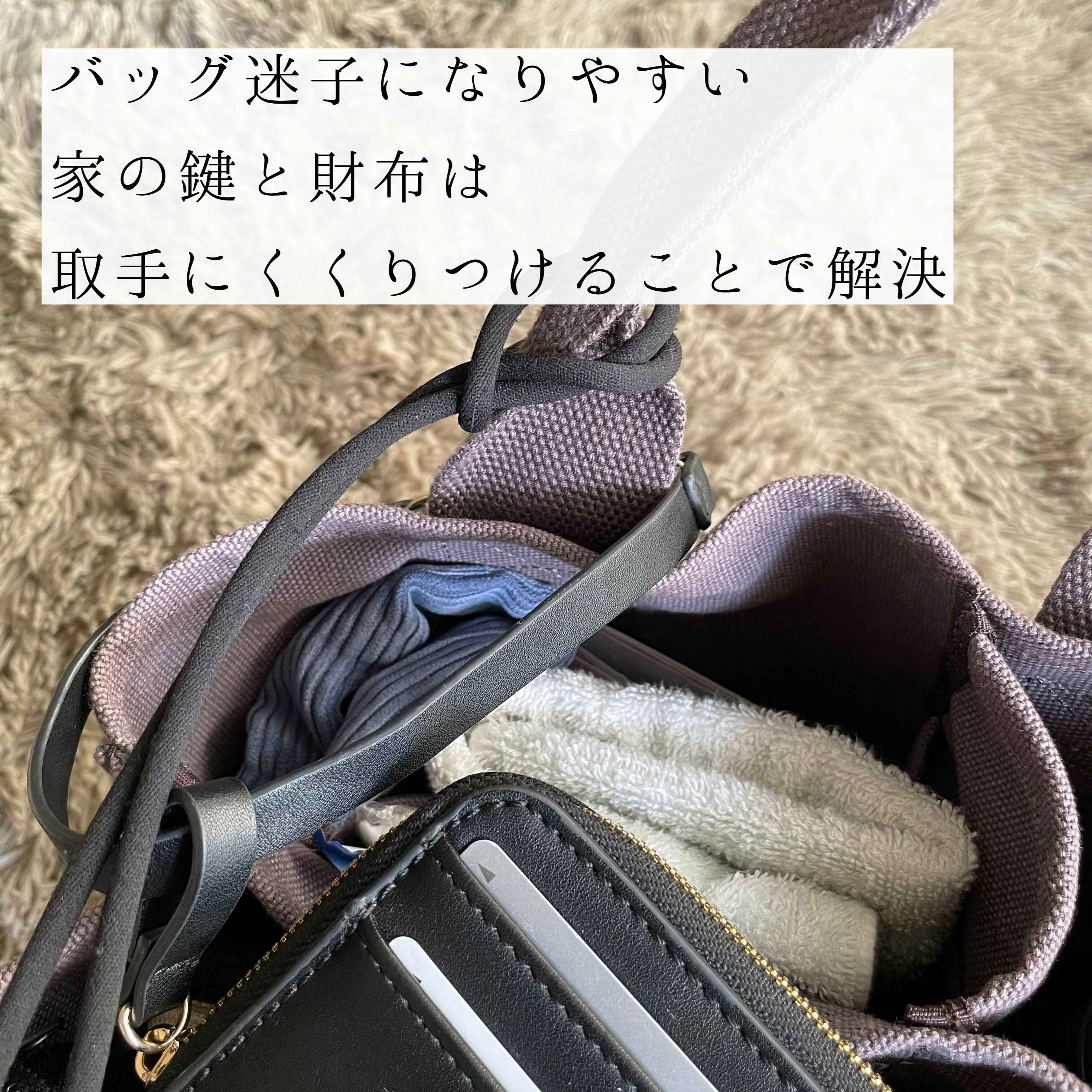 特に、バックの中で迷子になりやすい鍵や財布は、カバンの取っ手にくくりつけることで解決しました。