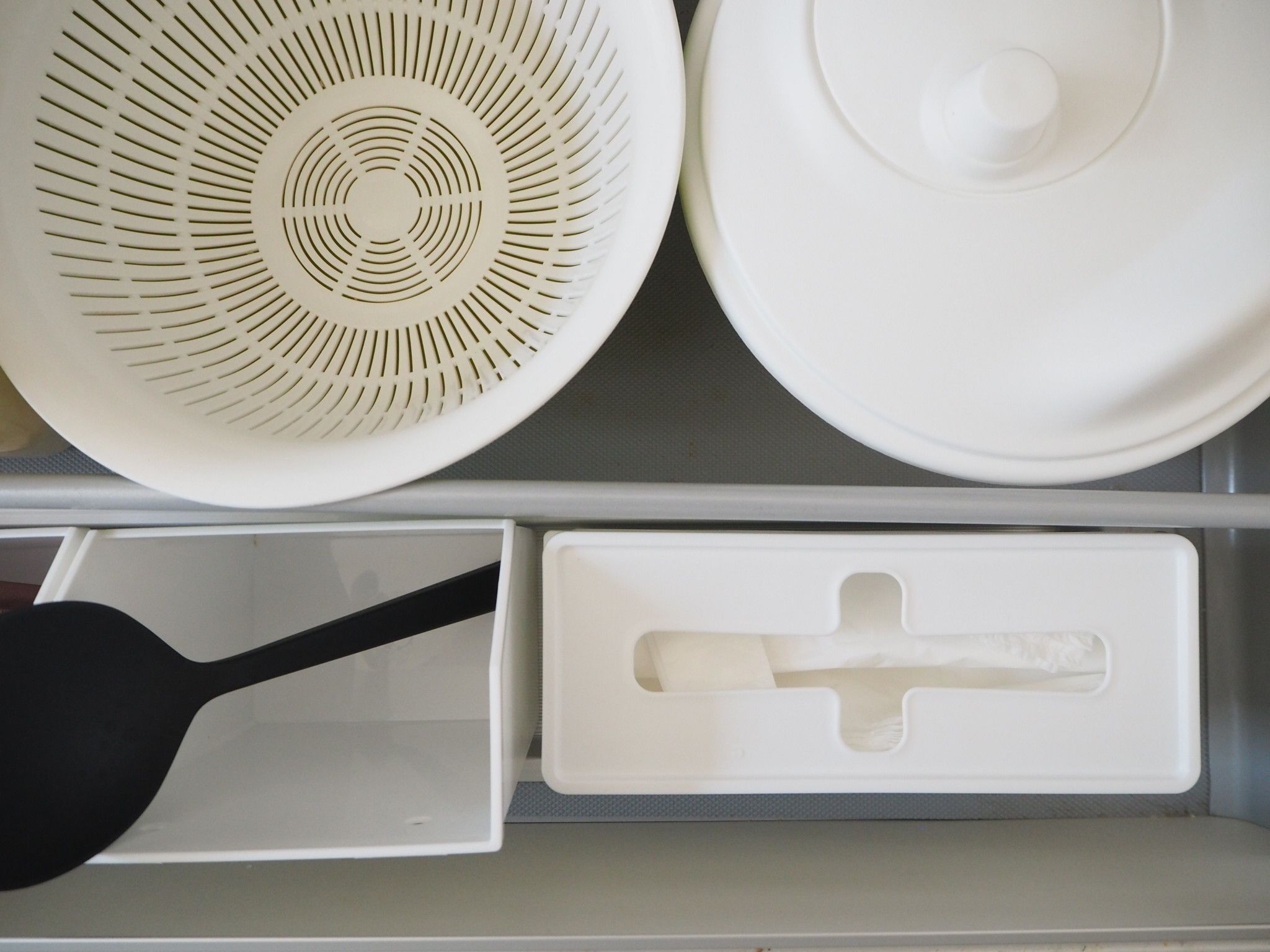 我が家ではキッチンのゴミ袋入れに使用しているので一番ゴミ箱から近い引き出しにセット!モノトーンで収納の中身も揃えるとごちゃつかずすっきりとした印象になります。