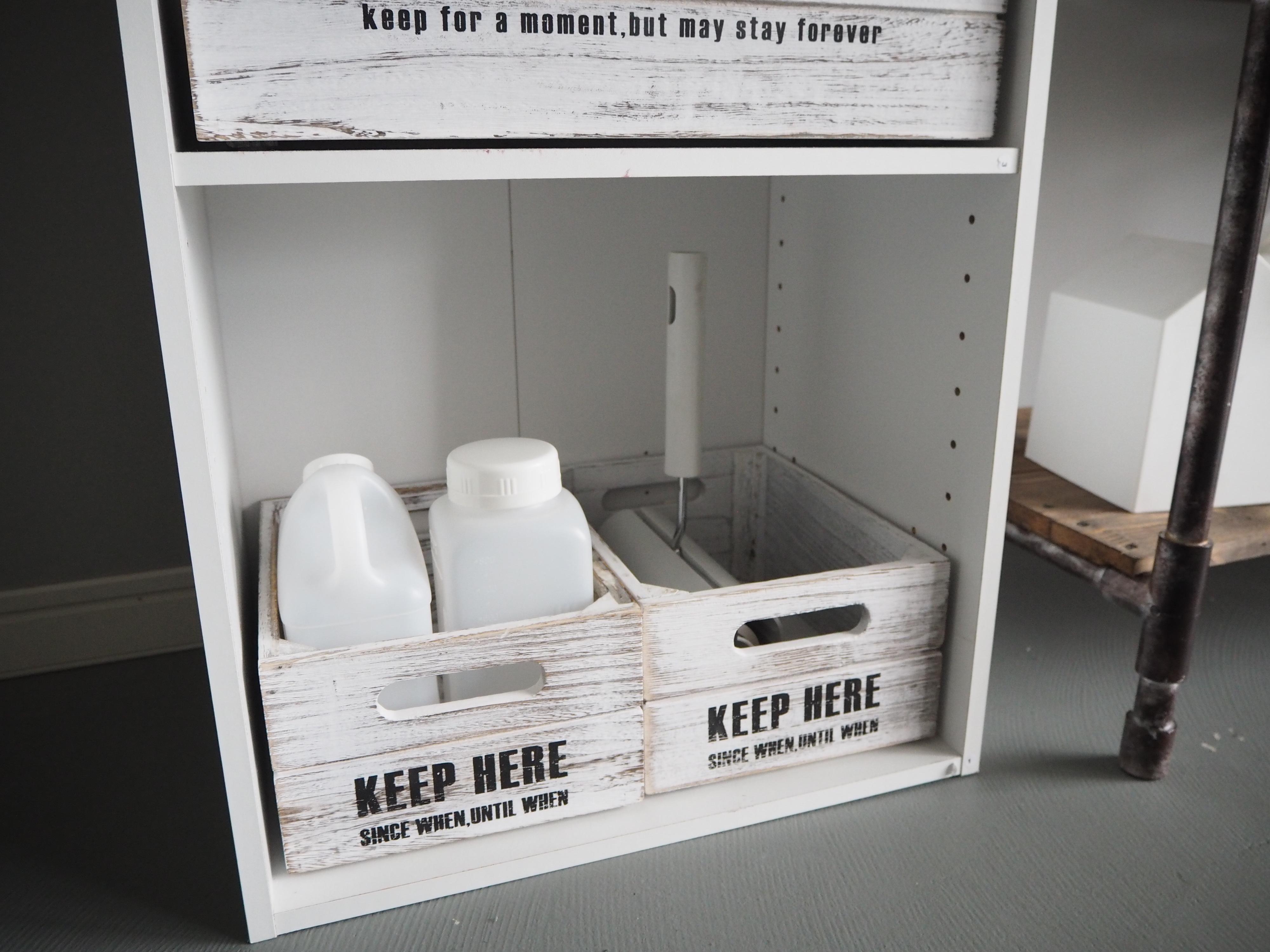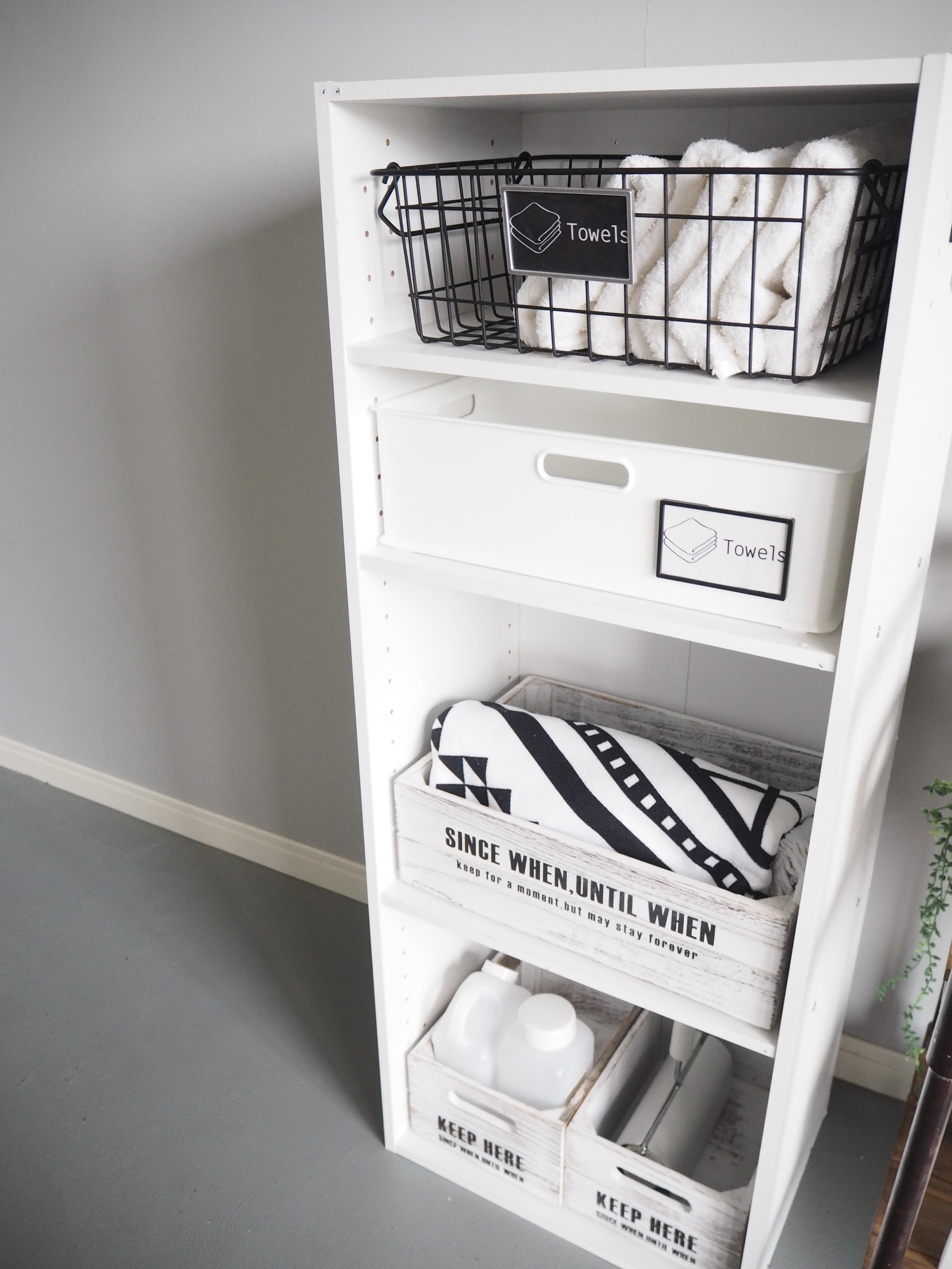 ティッシュなどの生活雑貨や工具類、マスクなど箱ごと棚に置くと生活感がたっぷりになってしまうようなものもすっきりと収納できます。また、このインボックス1個まで!と決めてストックすることで買いすぎをセーブできます。