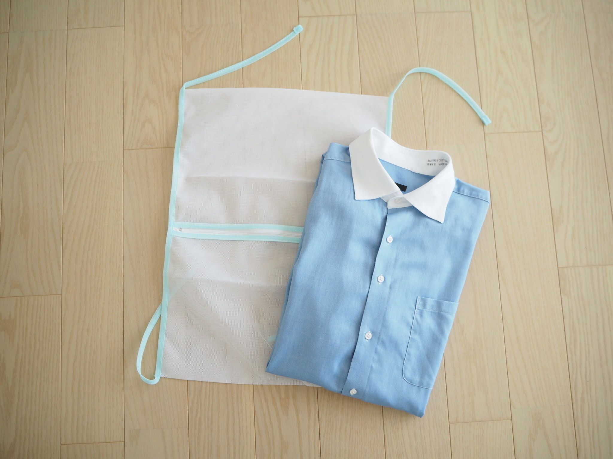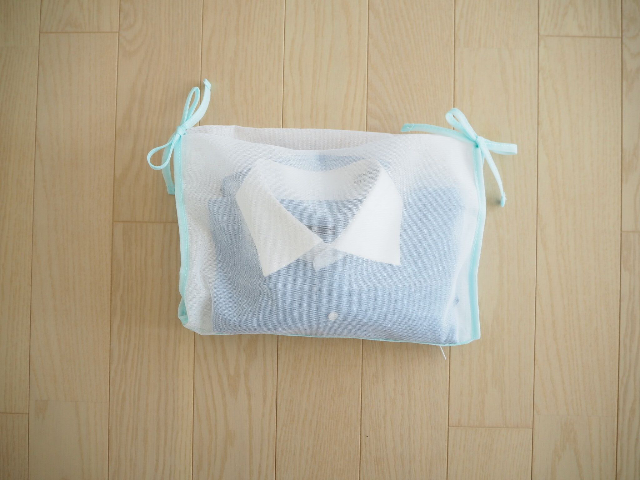 着用後のワイシャツは軽くたたんでネットに入れ、付属のひもで結べばコンパクトにしまえます。
