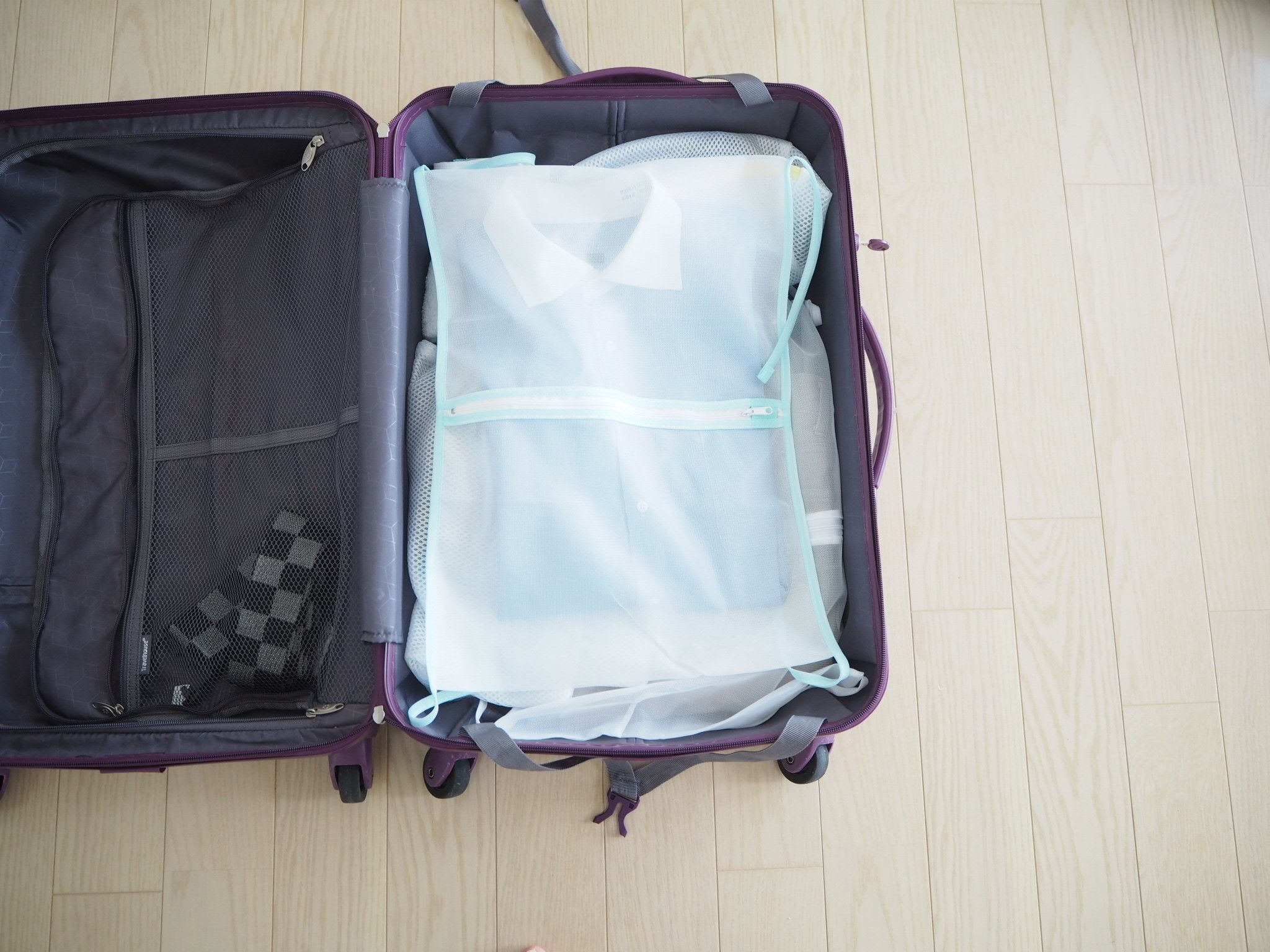 旅行この時期。ダイソーの洗濯ネットを使って、旅行の荷物をスッキリと!おススメです。