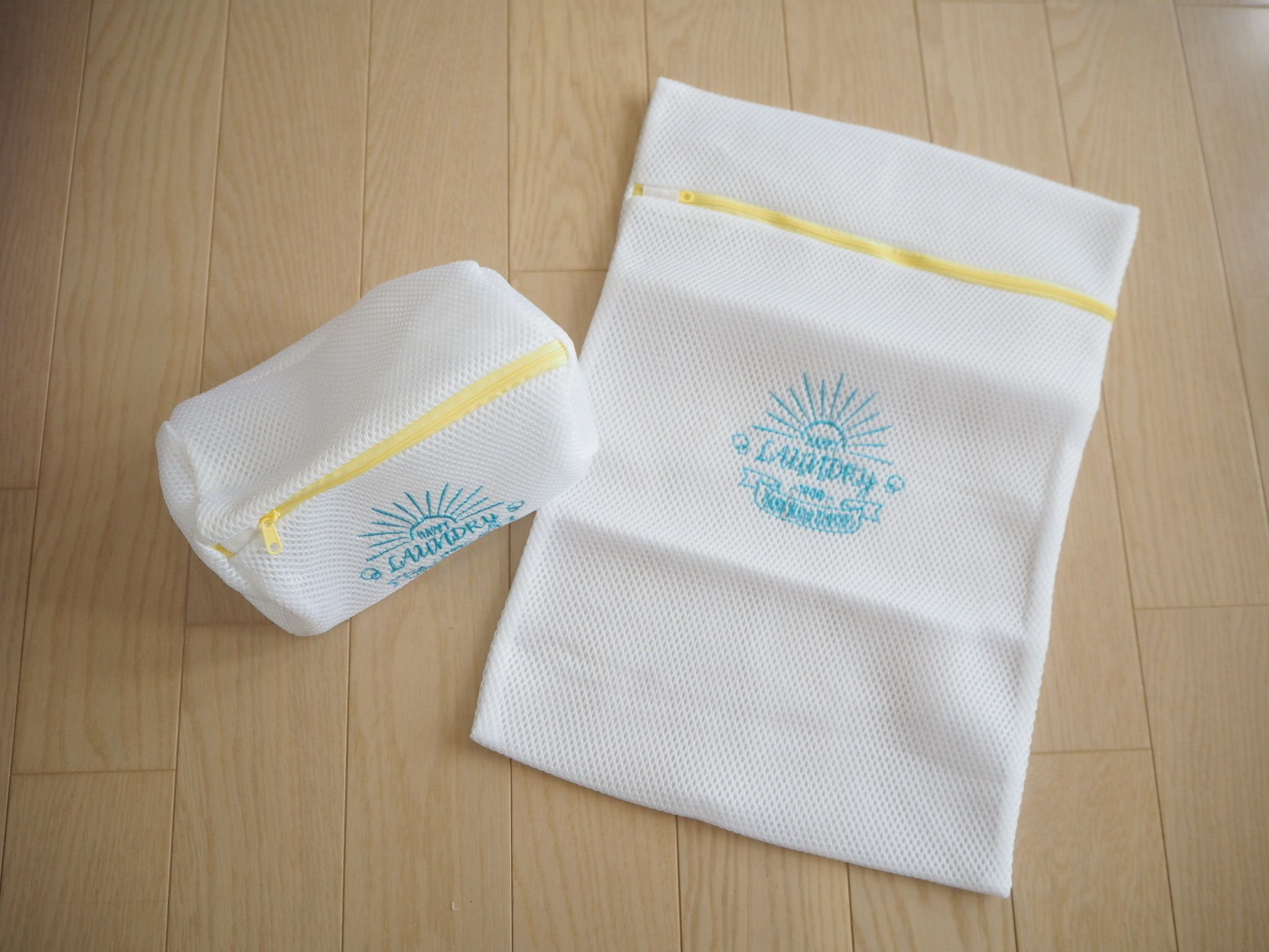 下着や靴下、ハンカチなどには小さなネット。左側は円筒形で下着にぴったり。右側のネットはTシャツや日よけのストールなどにおススメです。