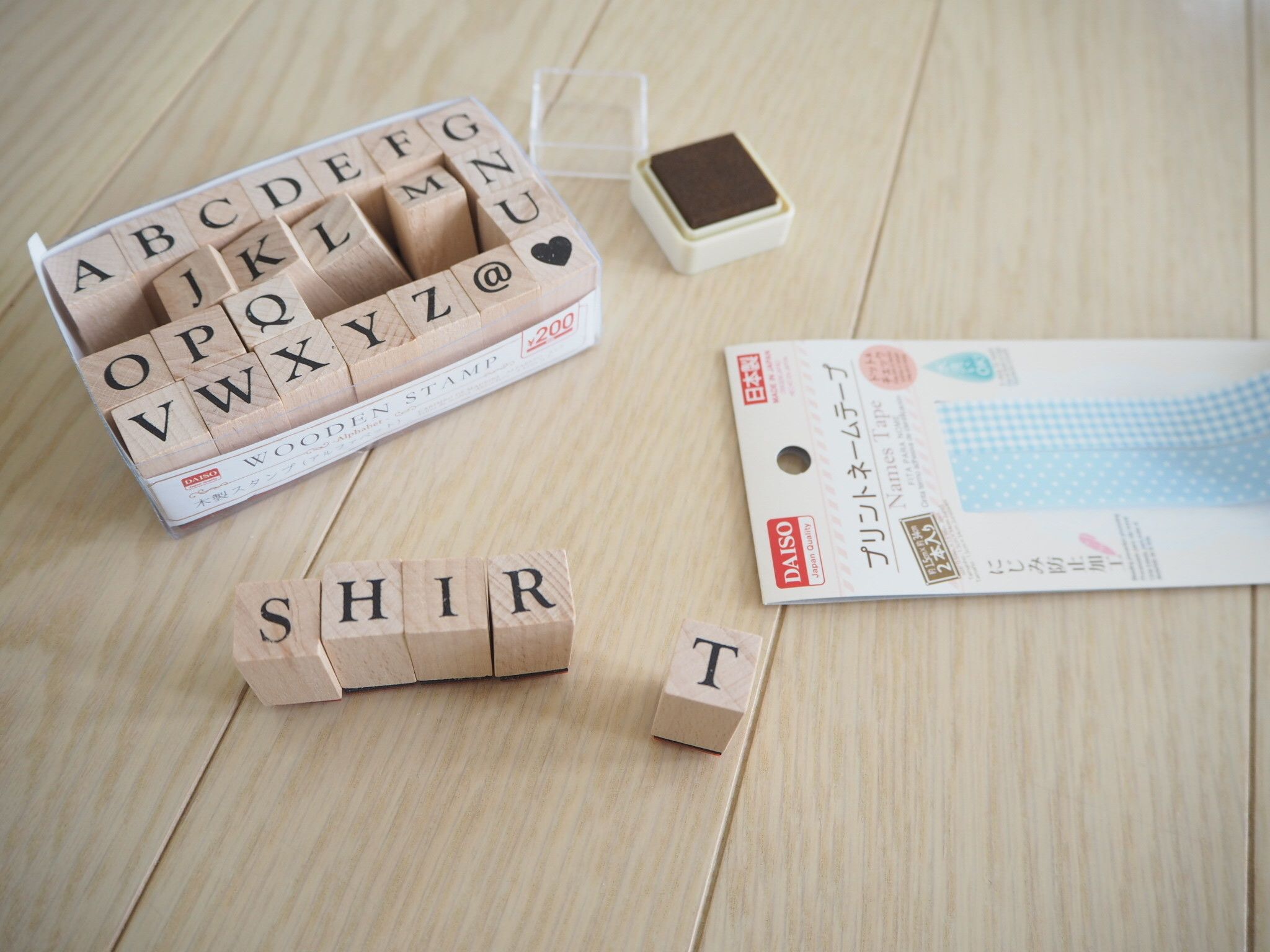 メッシュの目が細かいと中身がうっすらで見えにくい!同じ色の服を好む方にはダイソーのスタンプ「WOODEN STAMP」と布にアイロン粘着できる「プリントネームテープ」がオススメ!テープの幅とスタンプ幅がほぼ同じなのでまっすぐキレイに押しやすいです。インクは100均やホームセンターで購入できる布用を使用。