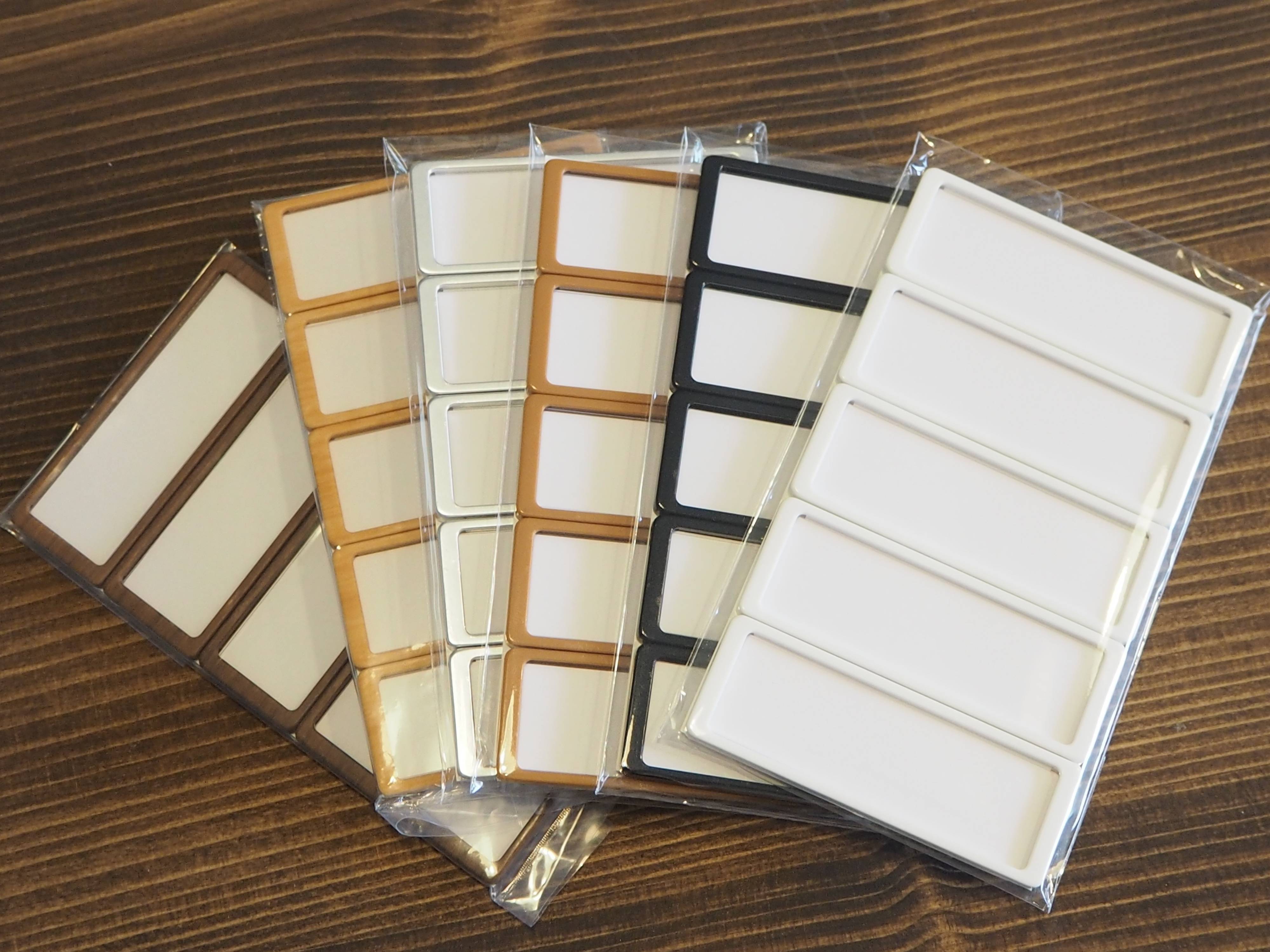 プレート色はうれしい6色(3グレード)。ちょっとカスタマイズした感が出るので愛着も倍増。5枚入り税464円(キャメルブラウン・マッドブラック・ネオホワイト)615円(マッドメタリック)、842円(ダークウッド・ナチュラルウッド)